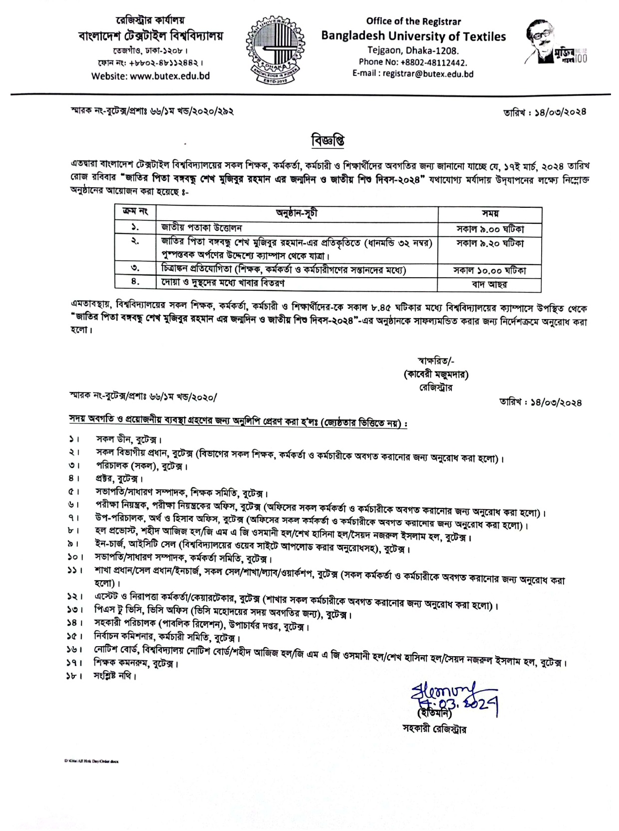 14 Mar 2024 আগামী ১৭ মার্চ, ২০২৪ তারিখ রোজ রবিবার যথাযোগ্য মর্যাদায় বঙ্গবন্ধু শেখ মুজিবুর রহমান এর জন্মদিন উৎযাপন ও জাতীয় শিশু দিবস-২০২৪ পালন এর বিজ্ঞপ্তি Administrative Notices News Desk