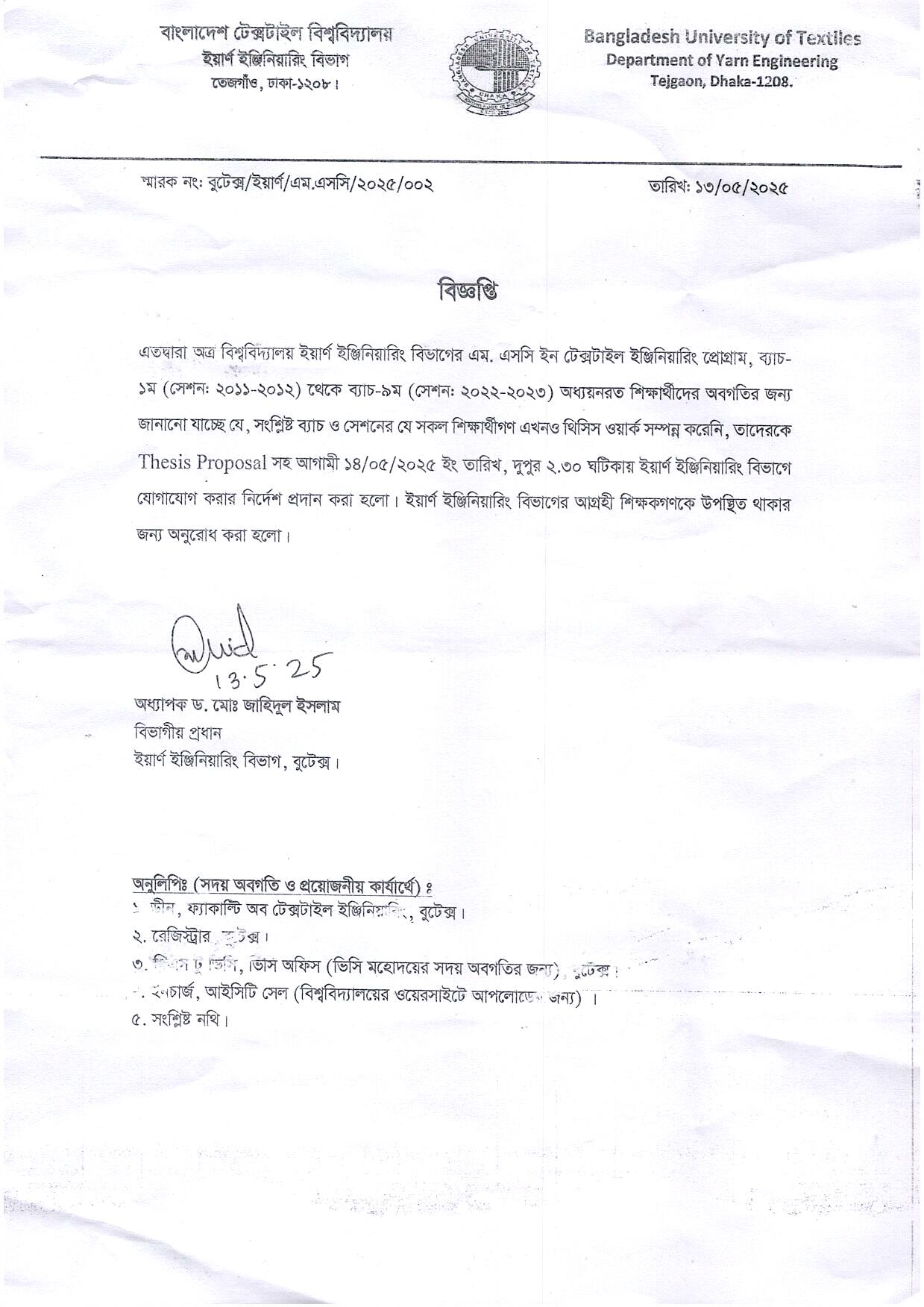 13 May 2025 বিজ্ঞপ্তিঃ ইয়ার্ণ ইঞ্জিঃ বিভাগের এম.এসসি ইন টেক্সটাইল ইঞ্জিঃ প্রোগ্রামের ব্যাচ ১ম থেকে ৯ম থিসিস ওয়ার্ক বিষয়। Academic Notices, DYE News