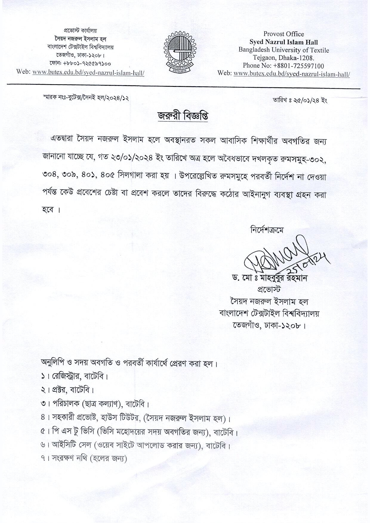 সৈয়দ নজরুল ইসলাম হলের জরুরী বিজ্ঞপ্তি
