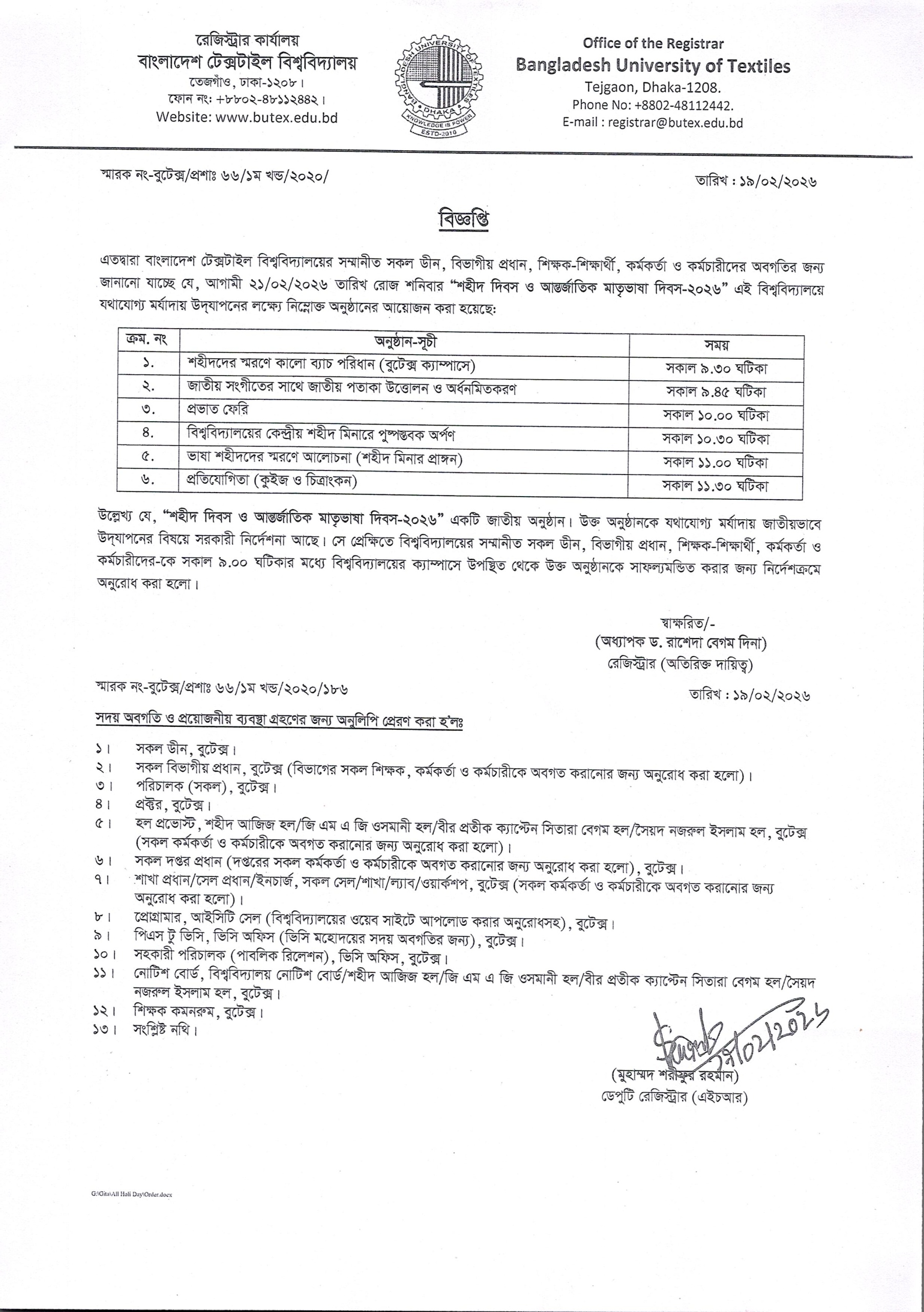 19 Feb 2026 ‘২১ শে ফেব্রুয়ারি: শহীদ দিবস ও আন্তর্জাতিক মাতৃভাষা দিবস-২০২৬ ’ আয়োজনে বাংলাদেশ টেক্সটাইল বিশ্ববিদ্যালয় Administrative Notices News