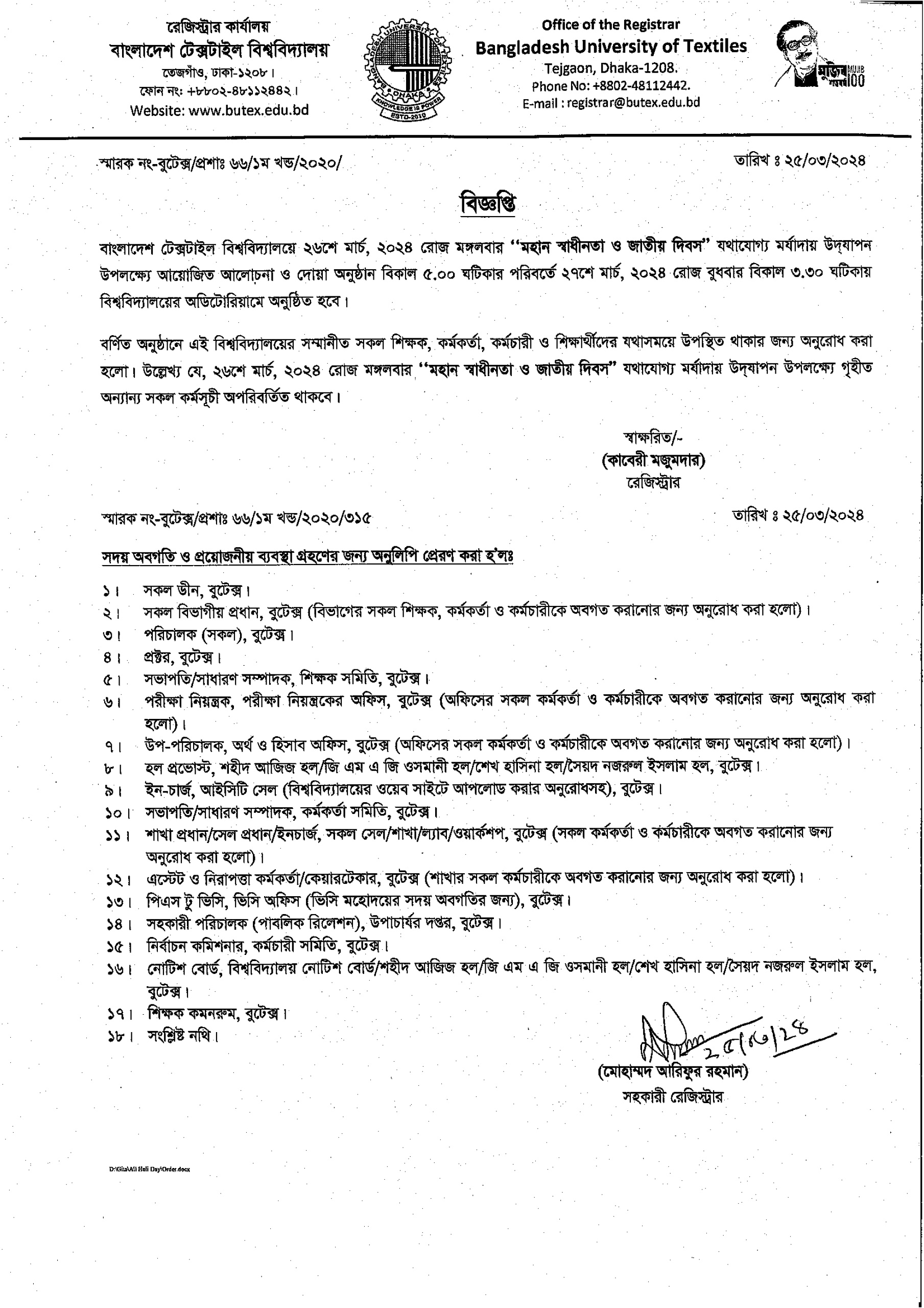 25 Mar 2024 ‘২৬শে মার্চ: মহান স্বাধীনতা ও জাতীয় দিবস’ উপলক্ষ্যে বিজ্ঞপ্তি Administrative Notices News Desk