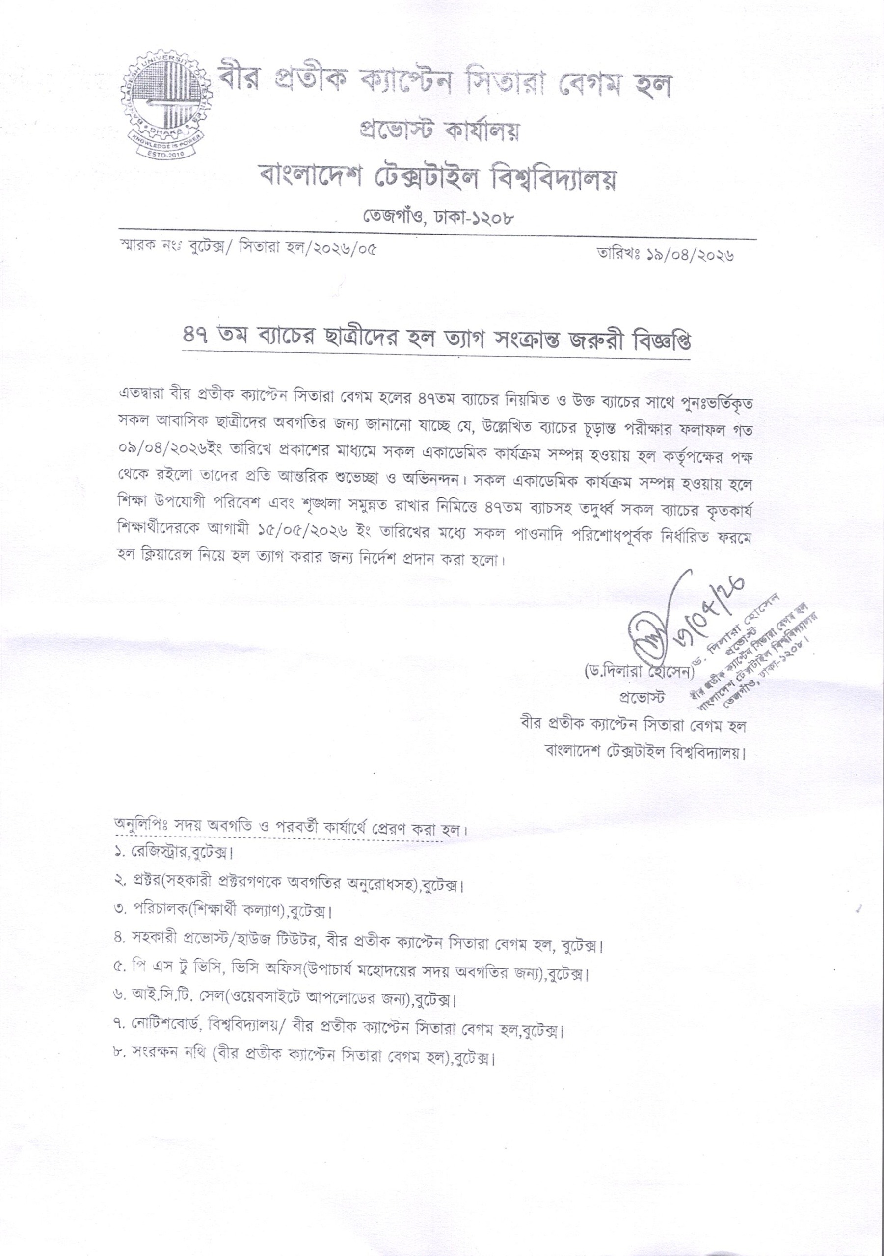 ৪৭তম ব্যাচ এর ছাত্রীদের হল ত্যাগের জরুরী বিজ্ঞপ্তি