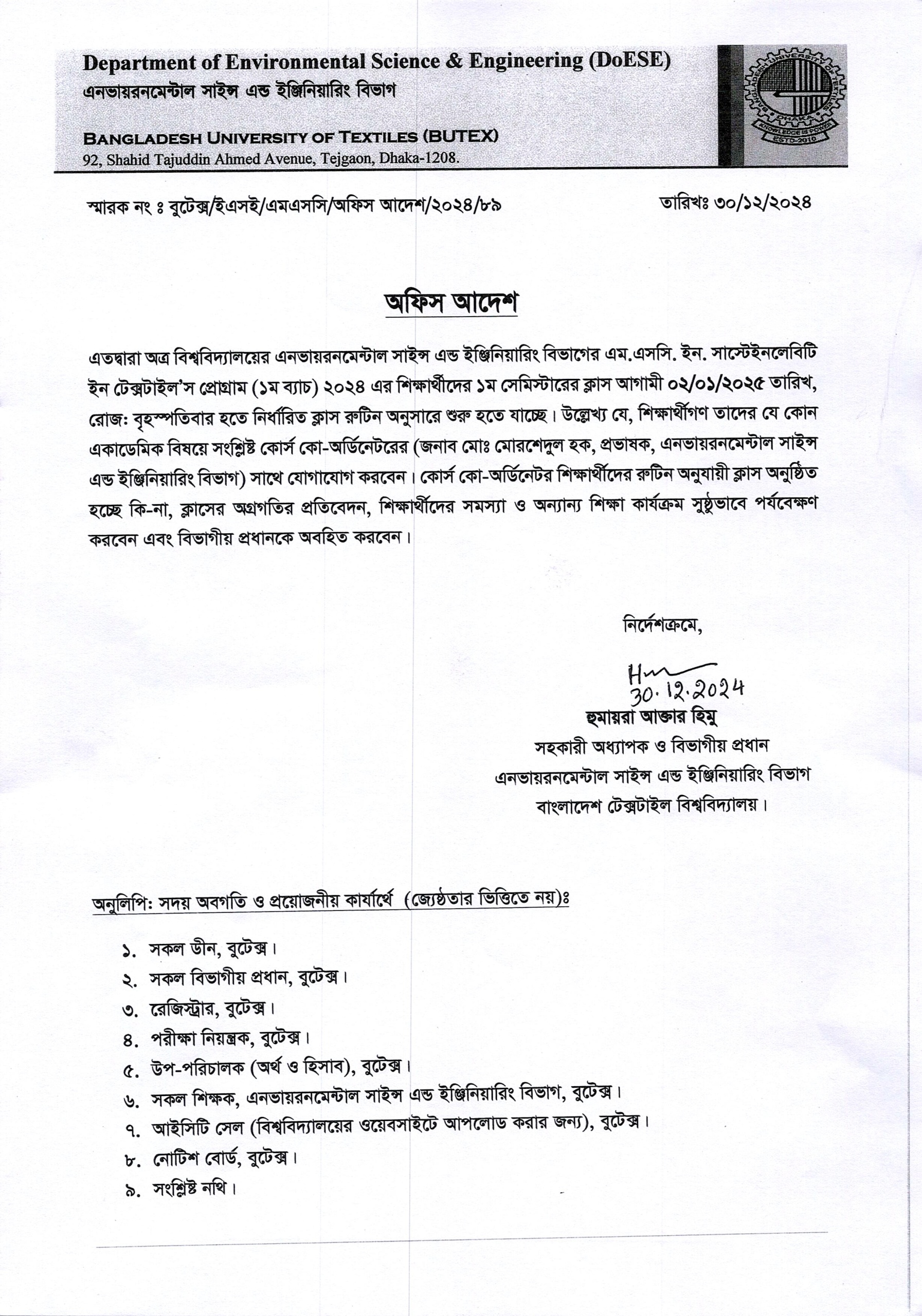 1st Semester Class Notice of MSc in Sustainabiblity in Textiles Program (ESE Dept.) 1st Batch