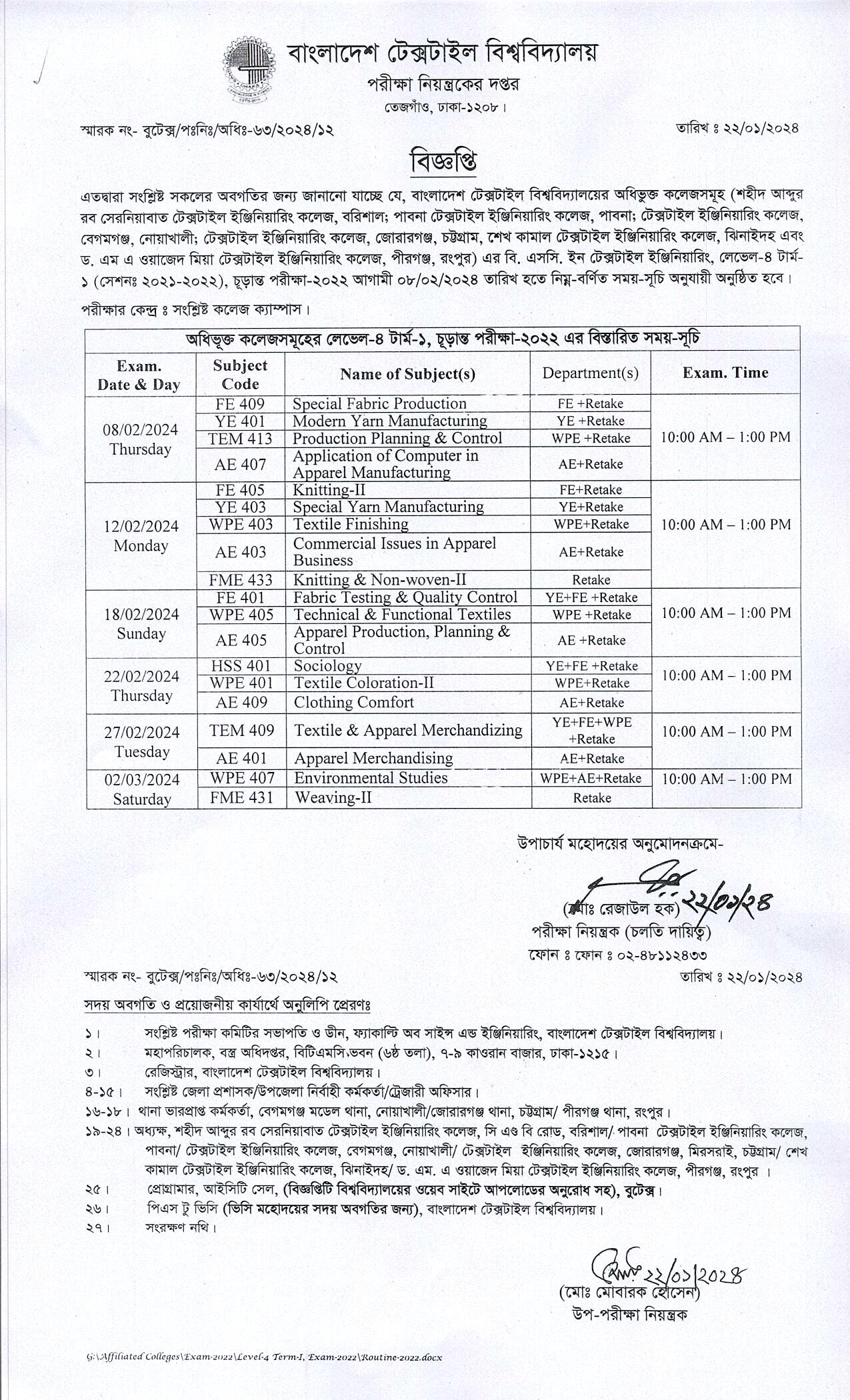 AC Exam Schedule BSc in Textile Engineering L-4 T-1 Exam-2022