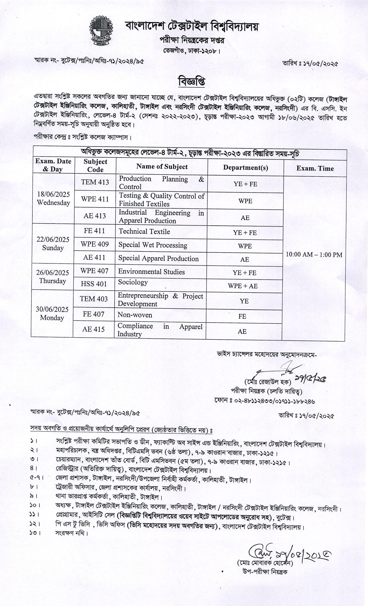 AC Exam Schedule: BSc in Textile Engineering L-4 T-2, Exam-2023
