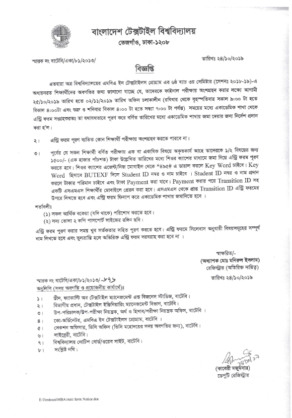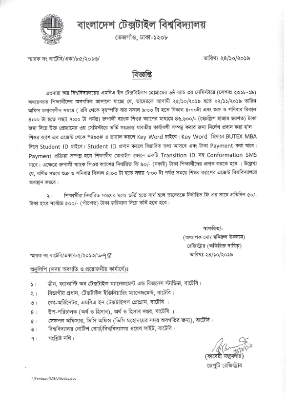 26 Oct 2019 Academic Notice: MBA in Textiles Program 6th Batch 3rd Semester Session 2018-19 Academic Notice: MBA in Textiles Program 6th Batch 3rd Semester Session 2018-19 Postgraduate Admission News Desk