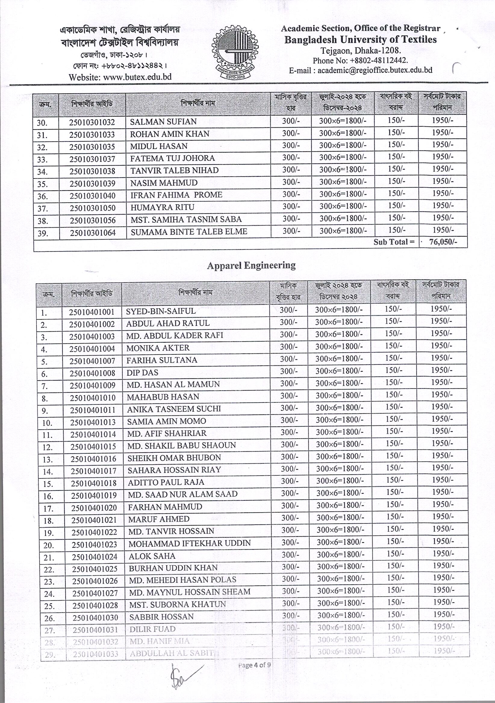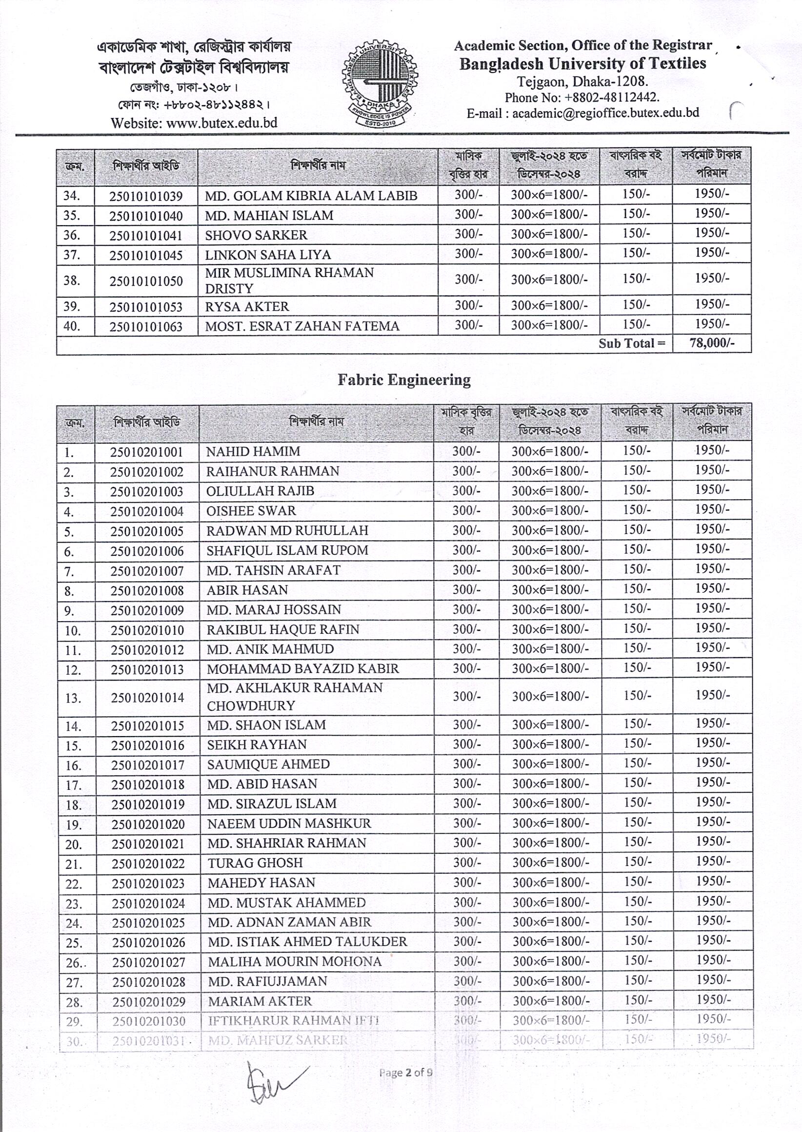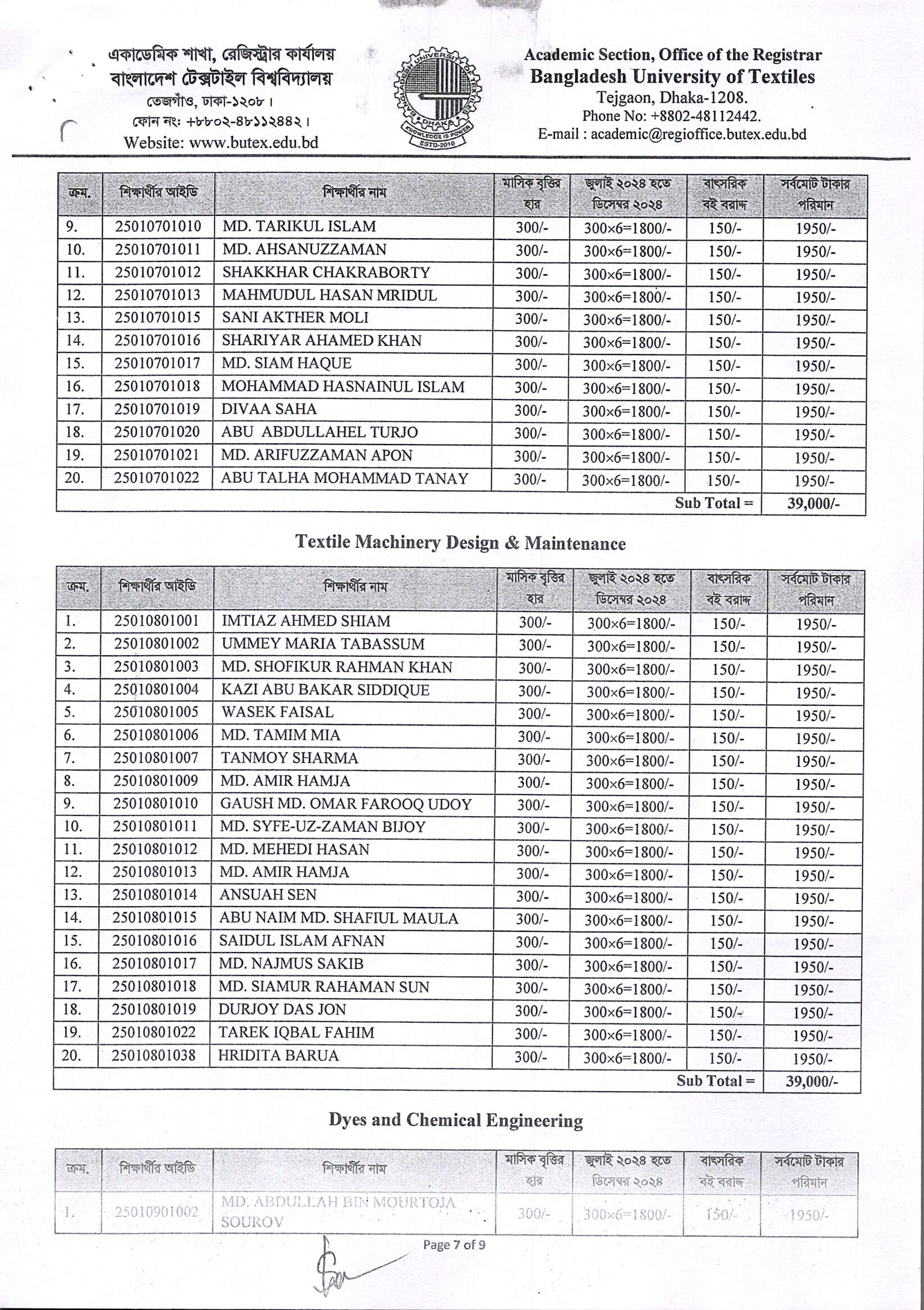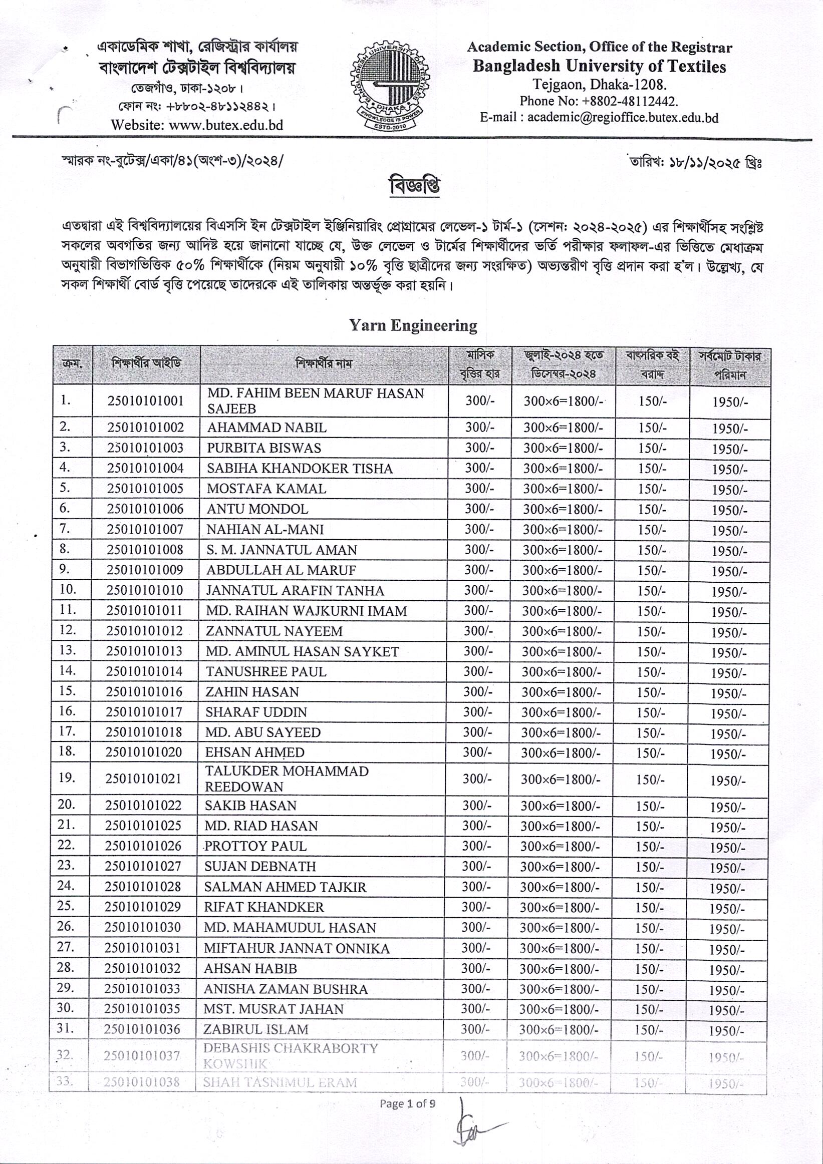 19 Nov 2025 Academic Scholarship of BSc in Textile Engineering L1-T1 Academic Notices, Undergrade Admission News