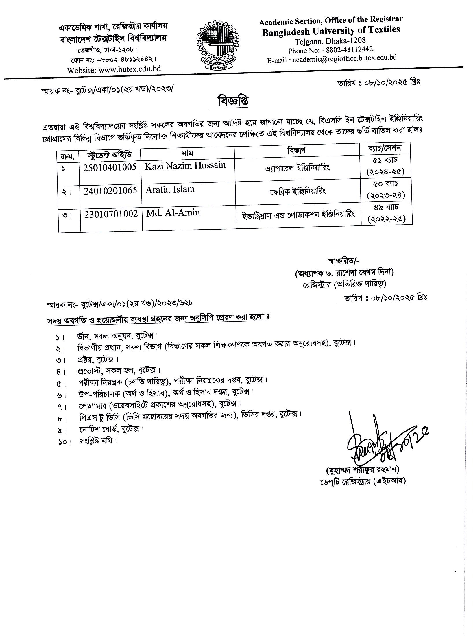 12 Oct 2025 Admission Cancellation Notice of BSc in Textile Engineering Dated: 12/10/2025 Academic Notices, Undergrade Admission News