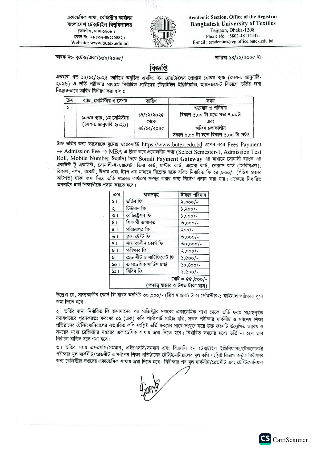 Admission Notice of MBA in Textiles Program 10th Batch 1st Semester