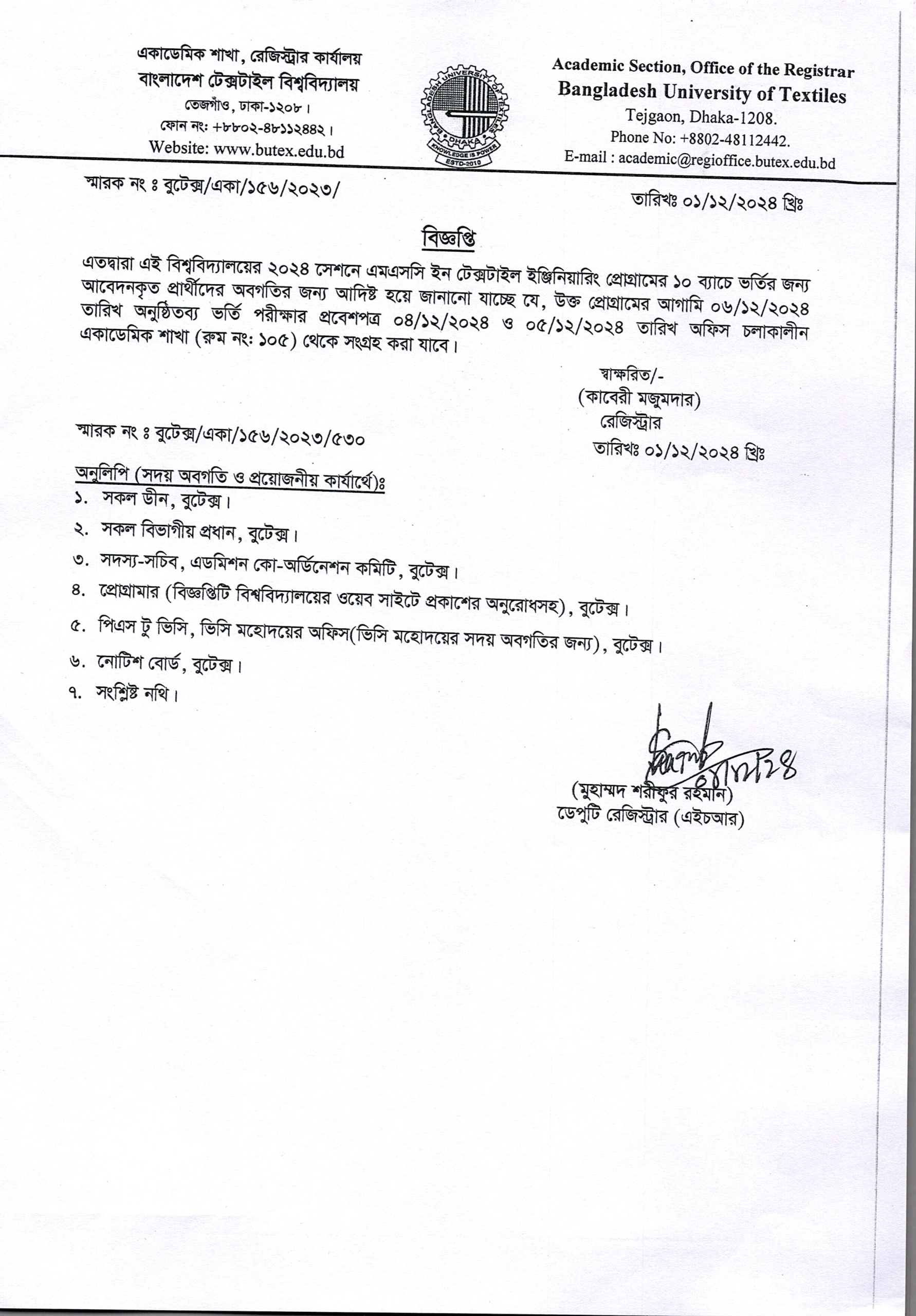 02 Dec 2024 Admit Card Notice of MSc in Textile Engineering Program 10th Batch Session 2024 Academic Notices News