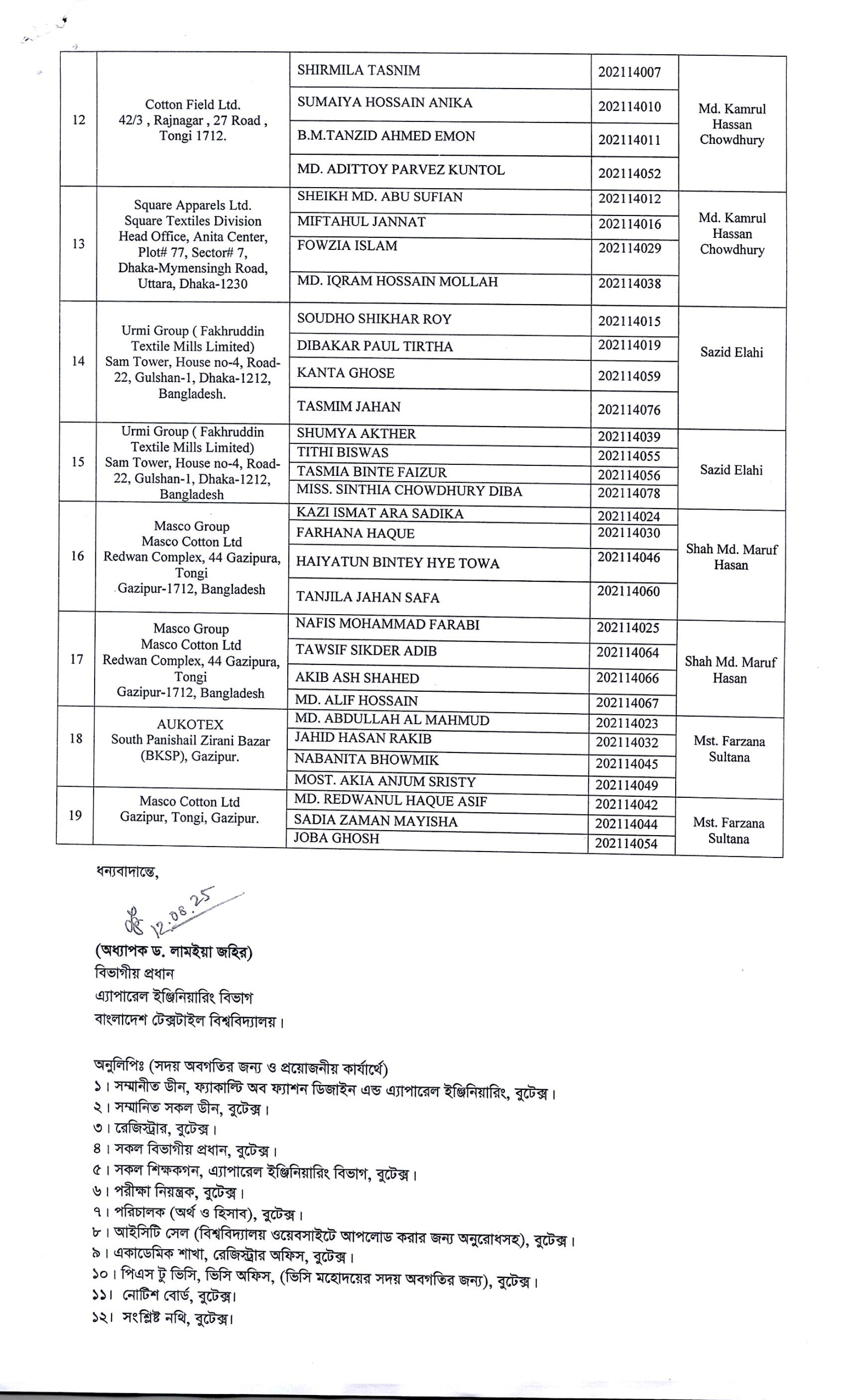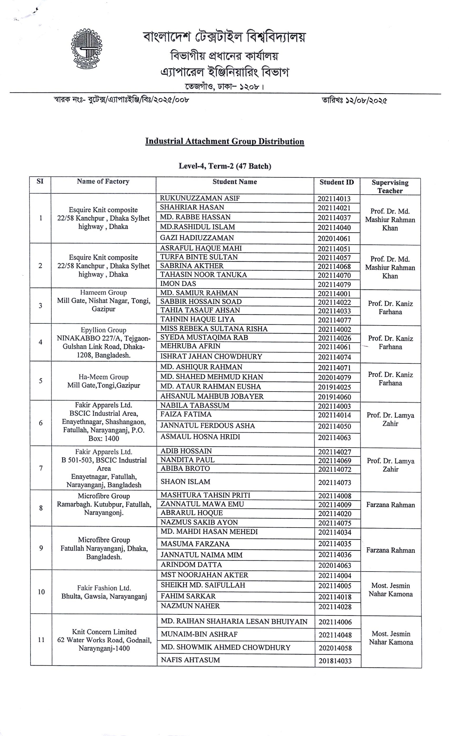 17 Aug 2025 AE Dept. Industrial Attachment Group of BSc in Textile Engineering L4-T2 (47 Batch) Academic Notices, DAE, Undergrade Admission News