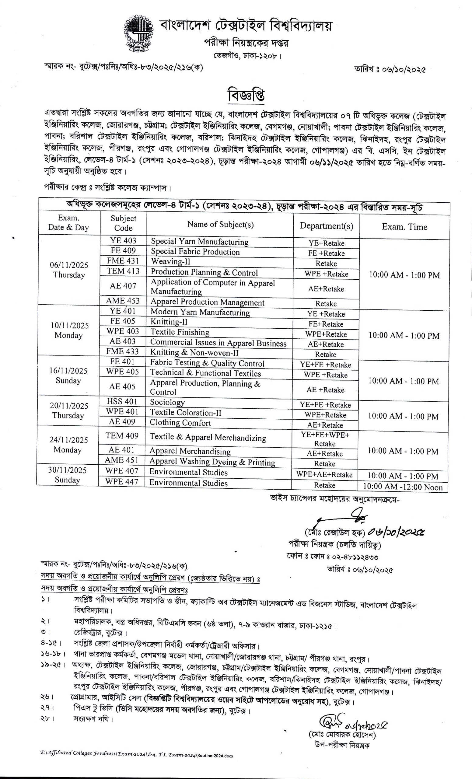 Affiliated Colleges Schedule of Level-4 Term-1 Exam-2024