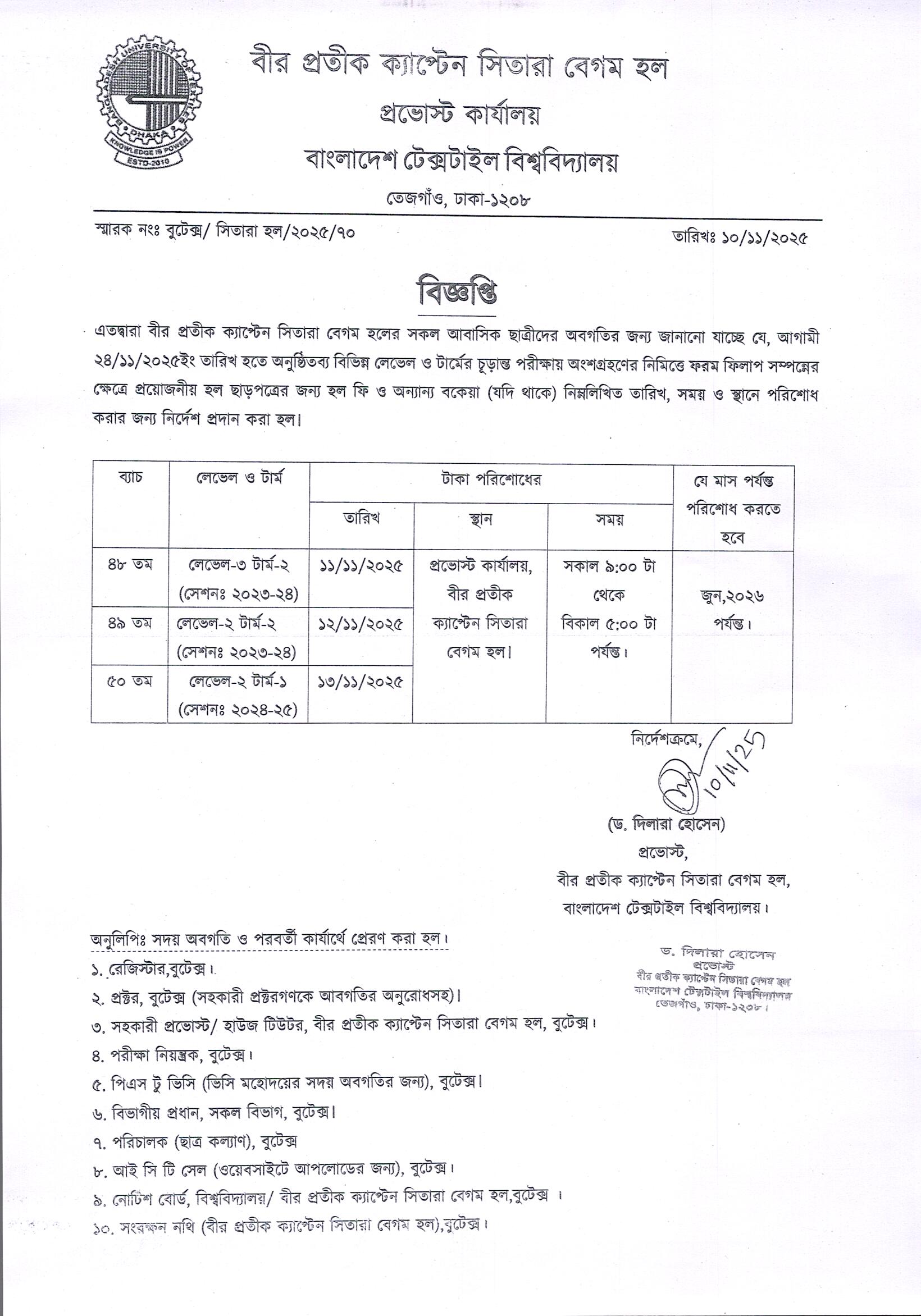 11 Nov 2025 Bir Protik Captain Sitara Begum Hall Clearance Notice of BSc in Textile Engineering L2-T1 L2-T2 L3-T2 Administrative Notices News