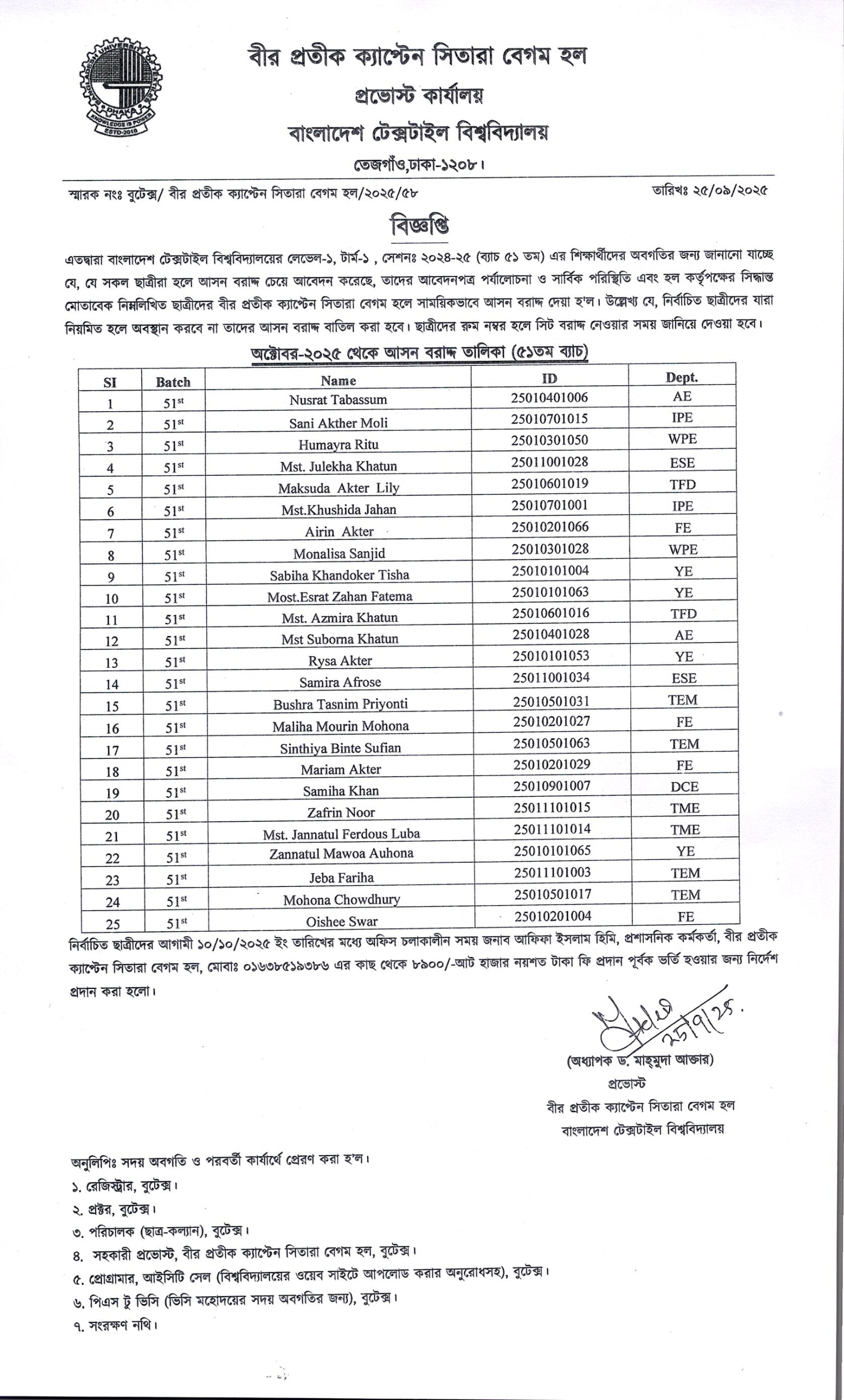 Bir Protik Captain Sitara Begum Hall: Seat Allotment for 51 Batch Students