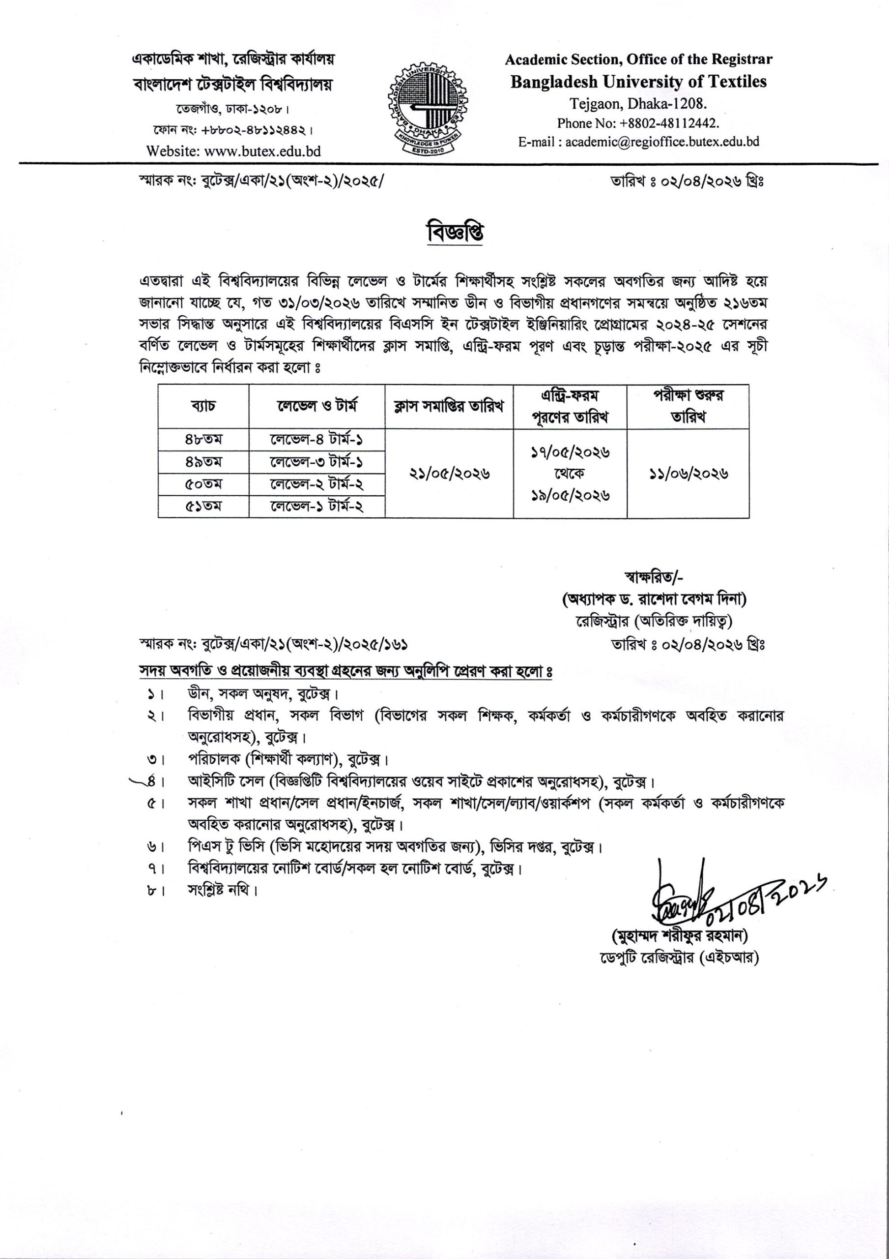 • Class, Entry Form & Exam Schedule of BSc in Textiles Program Session: 2024-25 April 2, 2026