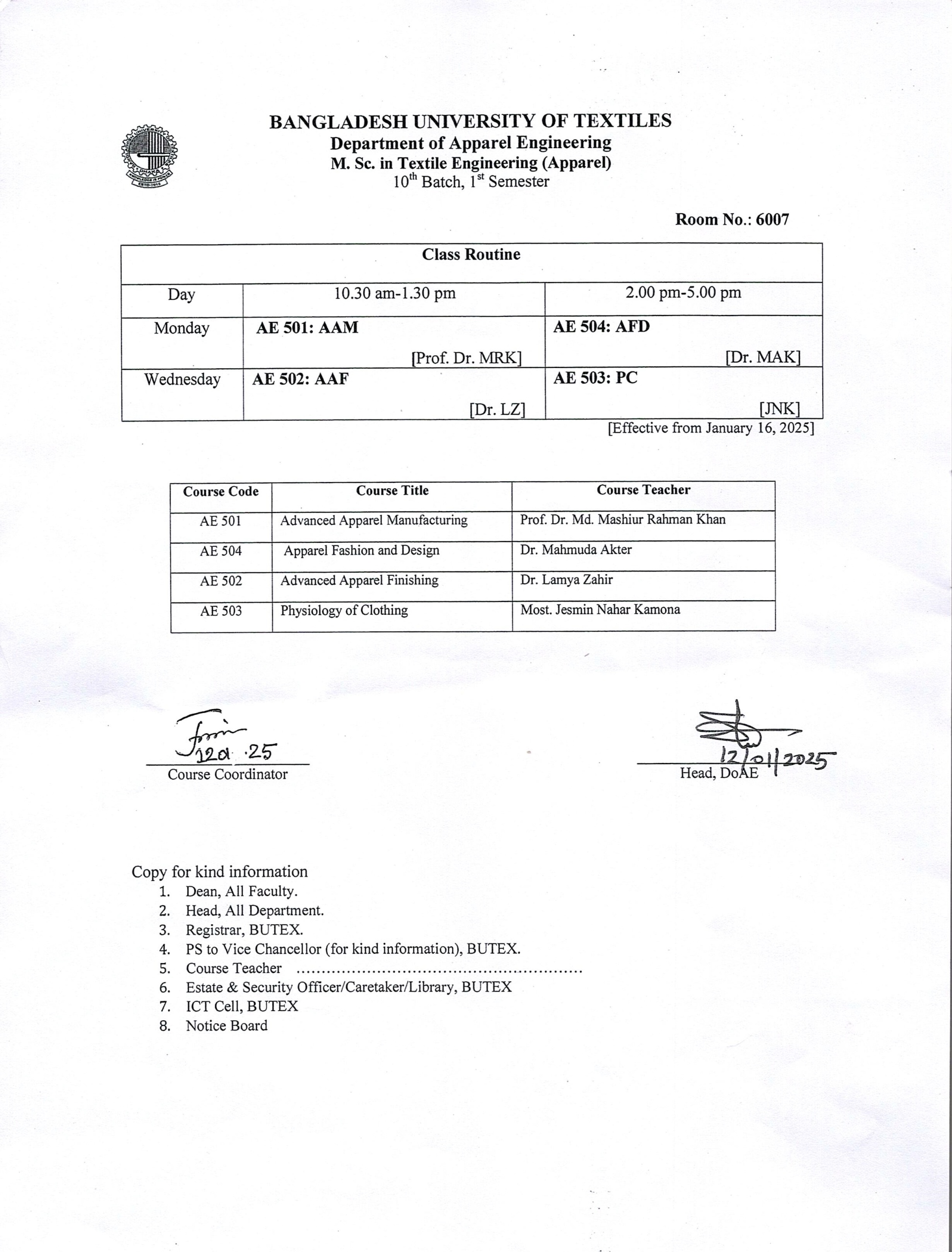19 Jan 2025 Class Routine of MSc in Textile Engineering (Apparel) 10th Batch 1st Semester Academic Notices, DAE, Undergrade Admission News