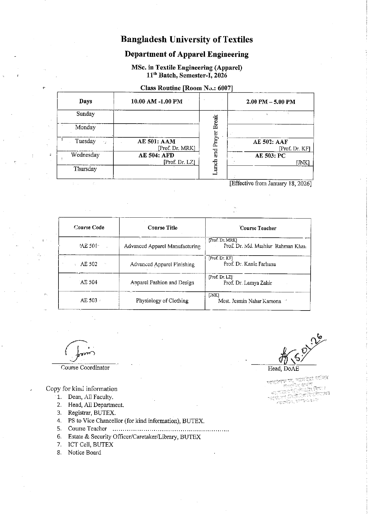 15 Jan 2026 Class Schedule of MSc in Textile Engineering (Apparel) 11th Batch Semester-I Academic Notices, DAE, Postgraduate Admission News