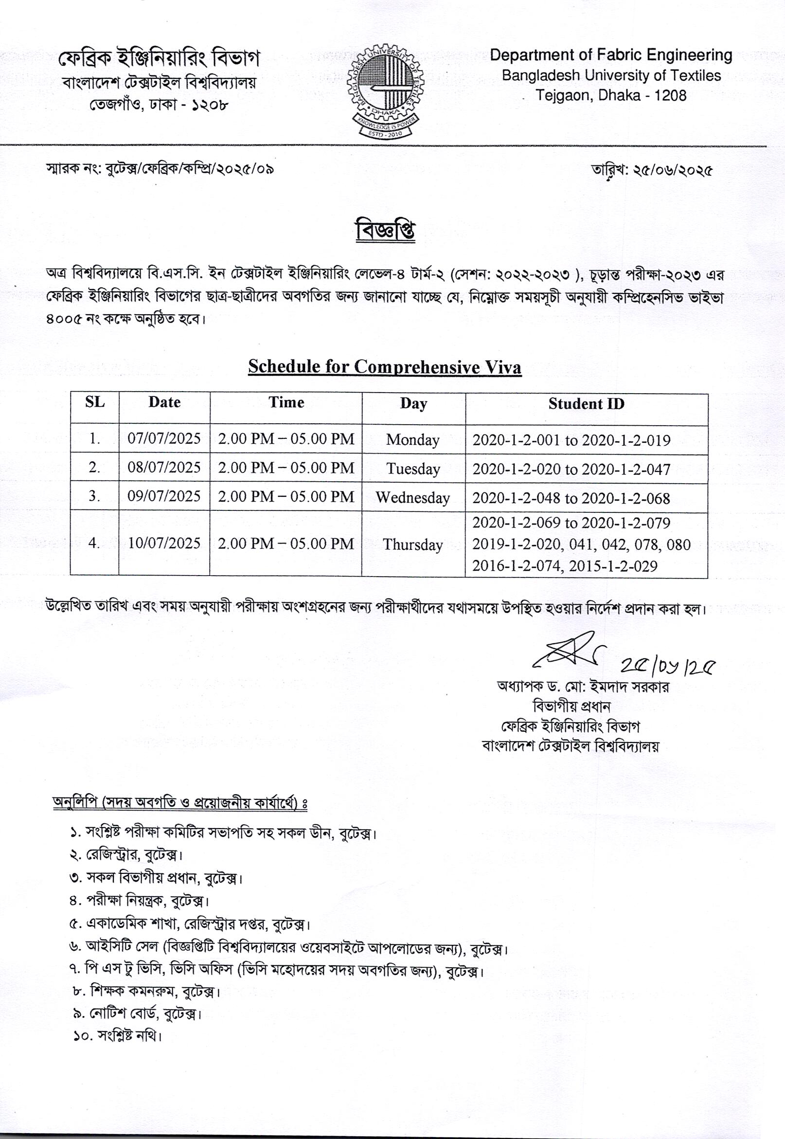 25 Jun 2025 Comprehensive Viva of BSc in Textile Engineering (Fabric Dept.) L-4 T-2 Exam-2023 Academic Notices, DFE, Undergrade Admission News