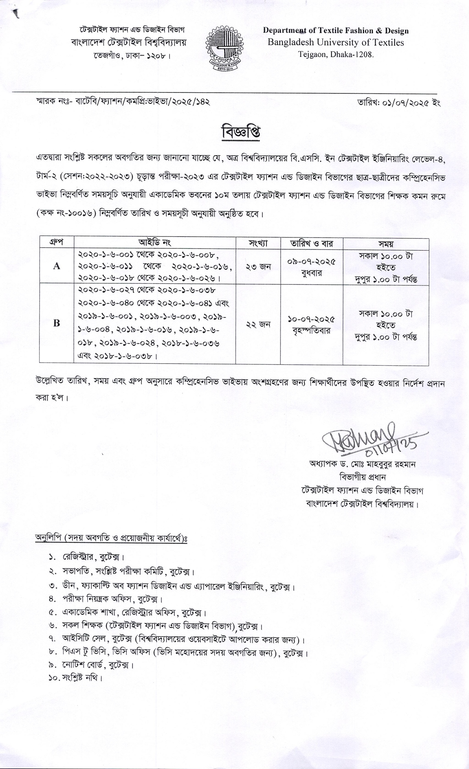 02 Jul 2025 Comprehensive Viva of BSc in Textile Engineering (TFD Dept.) L-4 T-2 Academic Notices, DTFD, Undergrade Admission News