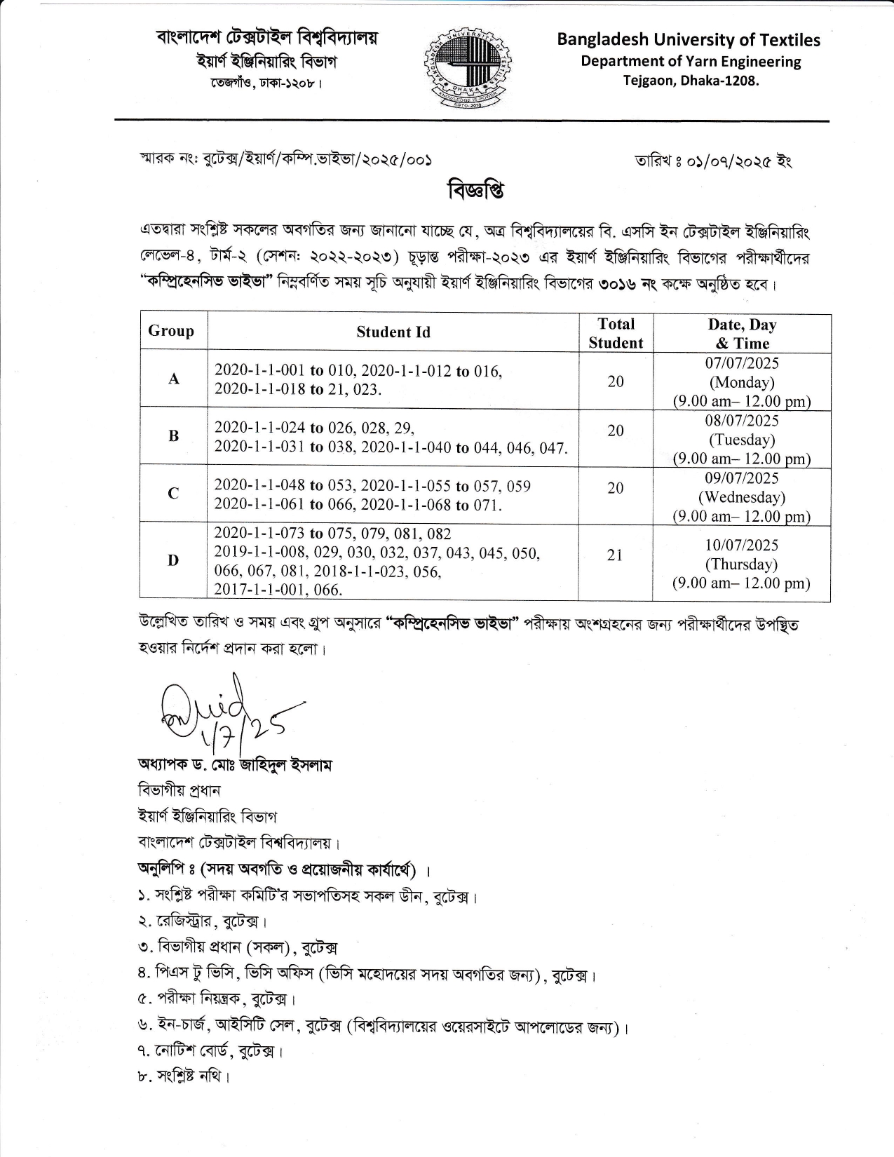 01 Jul 2025 Comprehensive Viva of BSc in Textile Engineering (Yarn Dept.) L-4 T-2 Academic Notices, DYE, Undergrade Admission News