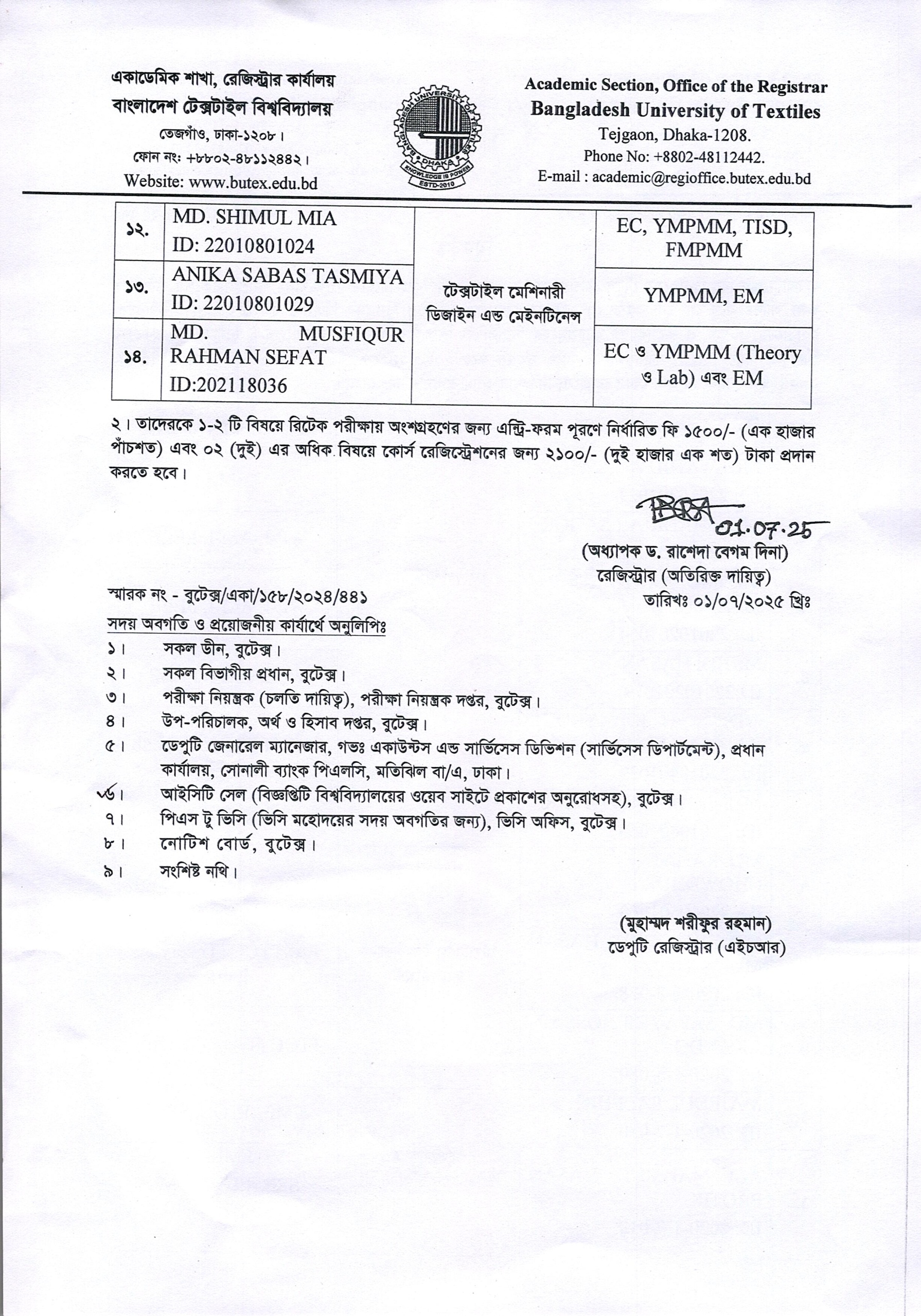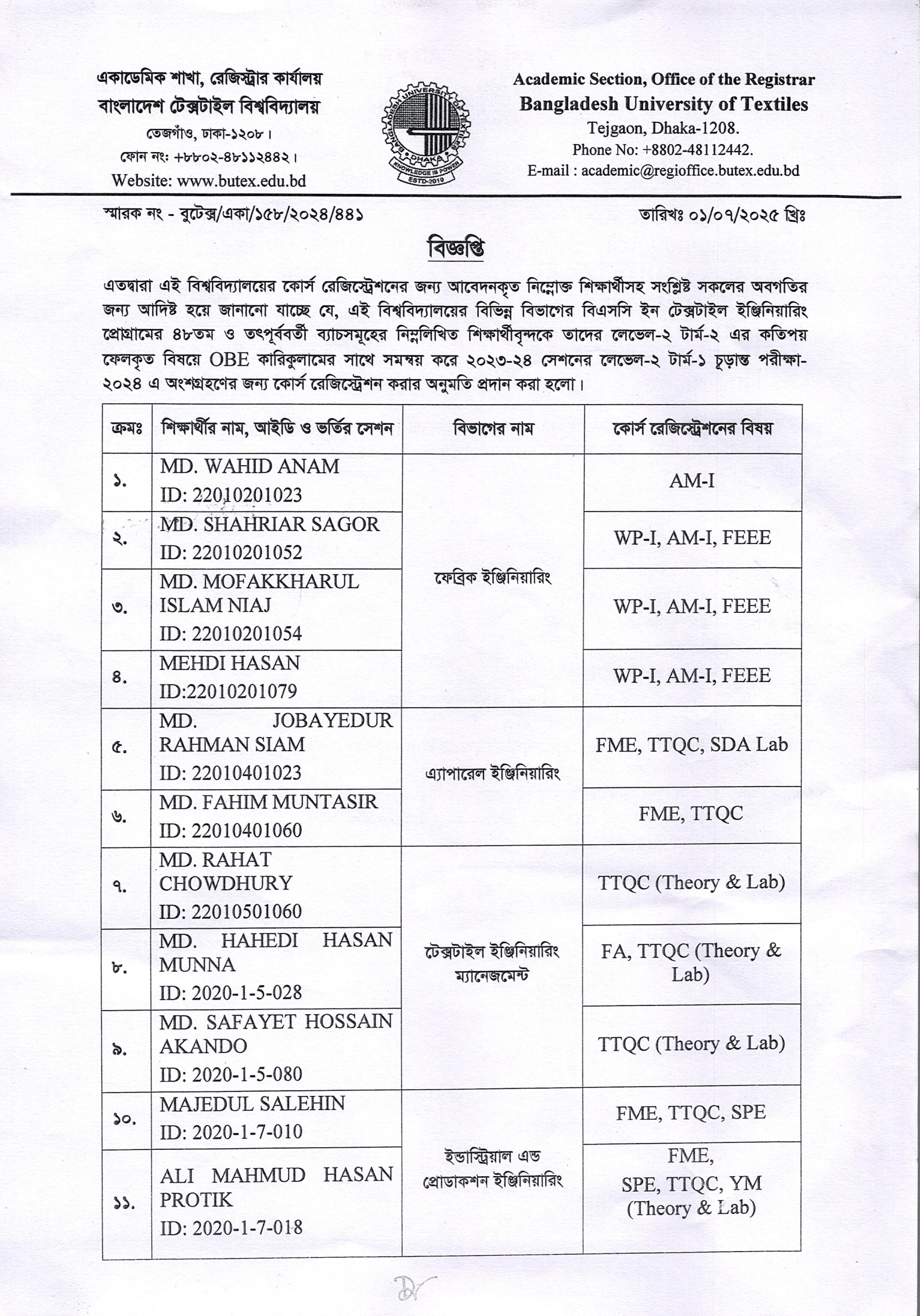 01 Jul 2025 Coure Registration Notice of L2-T1 Exam: 2024 Academic Notices, Undergrade Admission News