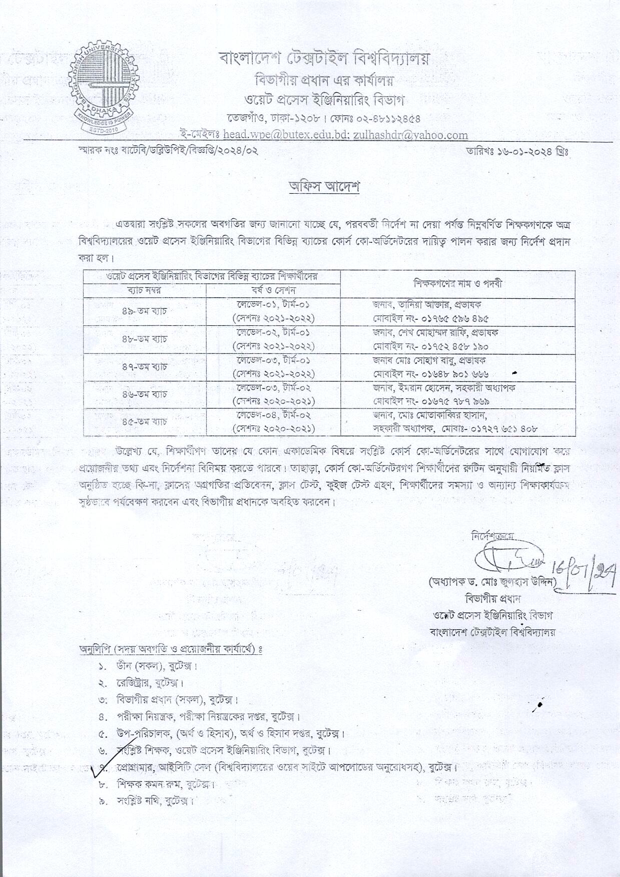 16 Jan 2024 Course Co-Ordinator List of Wet Process Engineering Dept. B.Sc. in Textile Engineering DWPE News