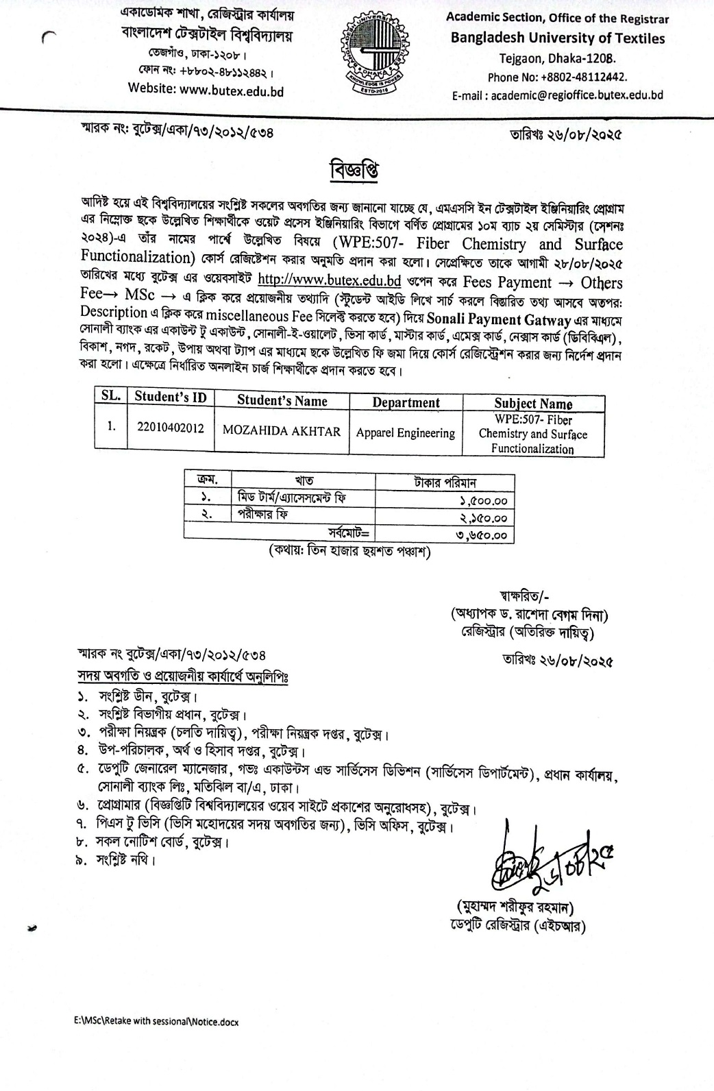 Course Registration Notice: MSc in Textile Engineering (WPE) 10th Batch Semester-II