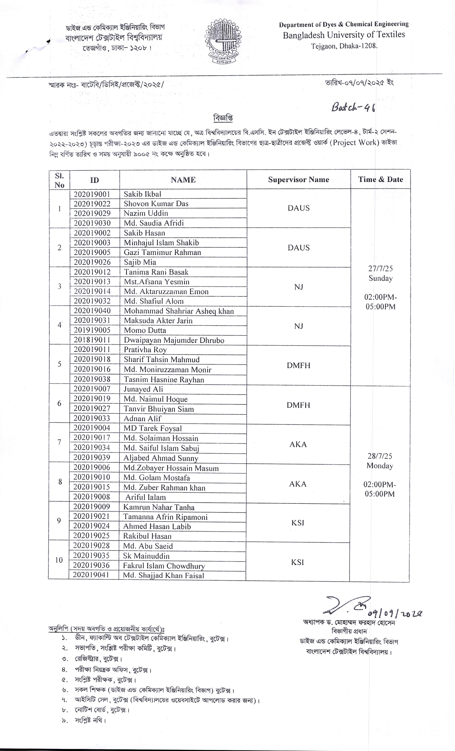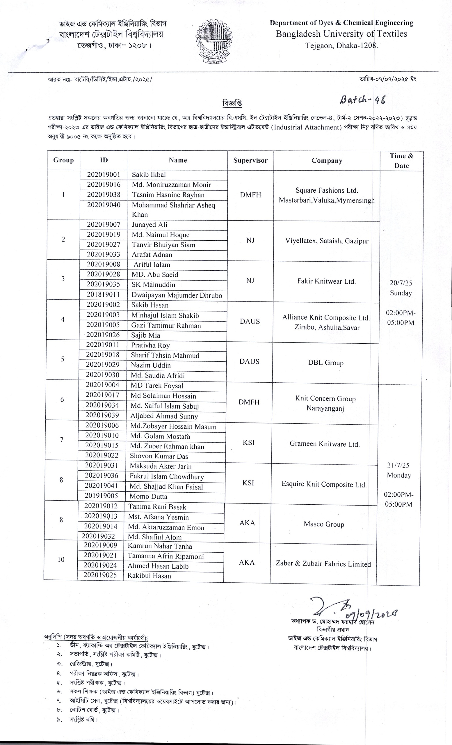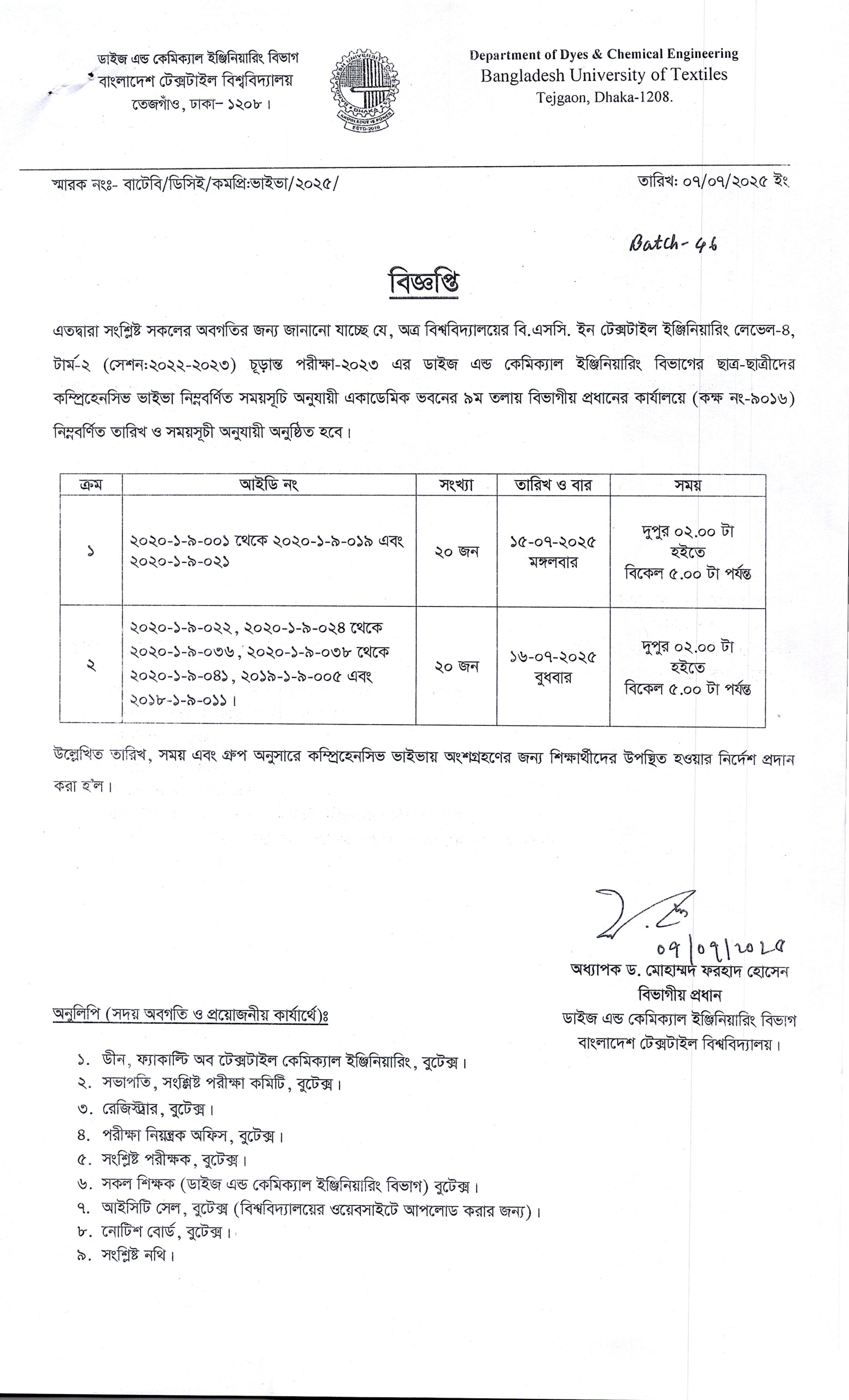 09 Jul 2025 DCE Dept. Comprehensive Viva, Project Work & Industrial Attachment of BSc in Textile Engineering L-4 T-2 Academic Notices, DCE, Undergrade Admission News