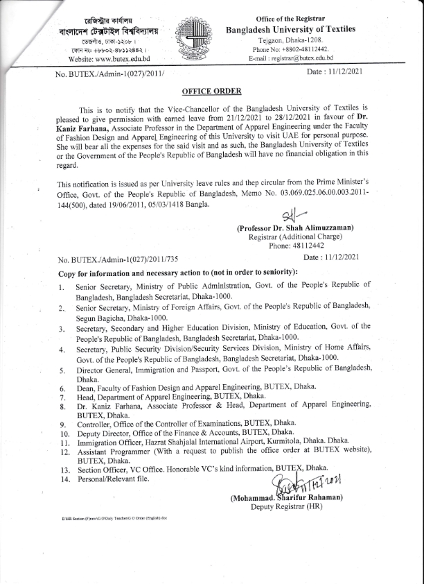 Office Order: Dr. Kaniz Farhana, Associate Professor, DoAE