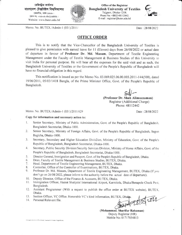 Office Order: Dr. Md. Masum, Professor, Dept. of Textile Eng. Management