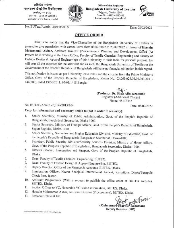 Office Order: Hossain Mohammad Akbar, Assistant Director, PnD Office