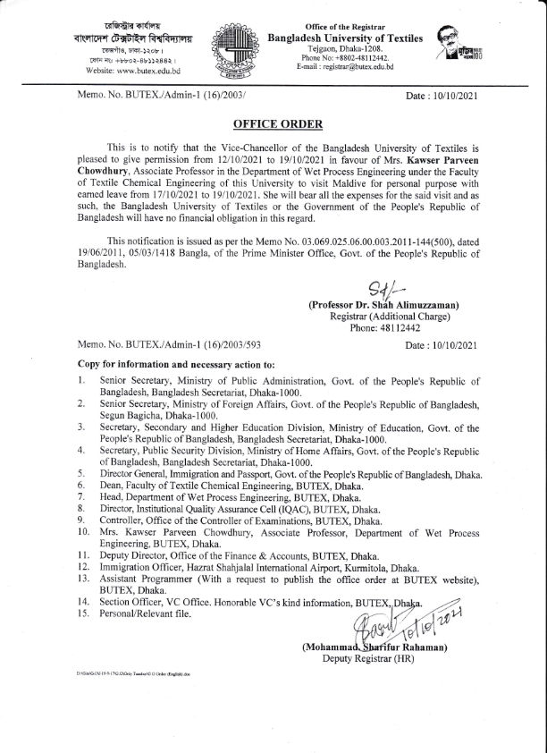 Office Order: Mrs. Kawser Parveen Chowdhury, Associate Professor, DoWPE