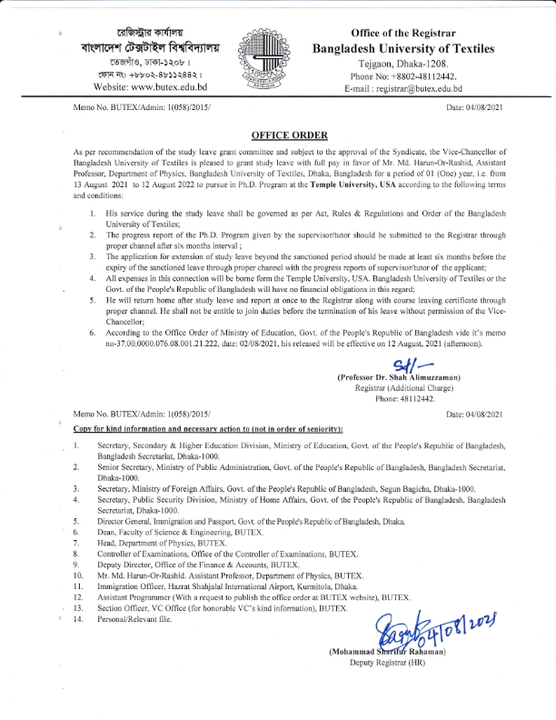 Office Order : Mr. Md. Harun-Or-Rashid, Assistant Professor, Do Physics