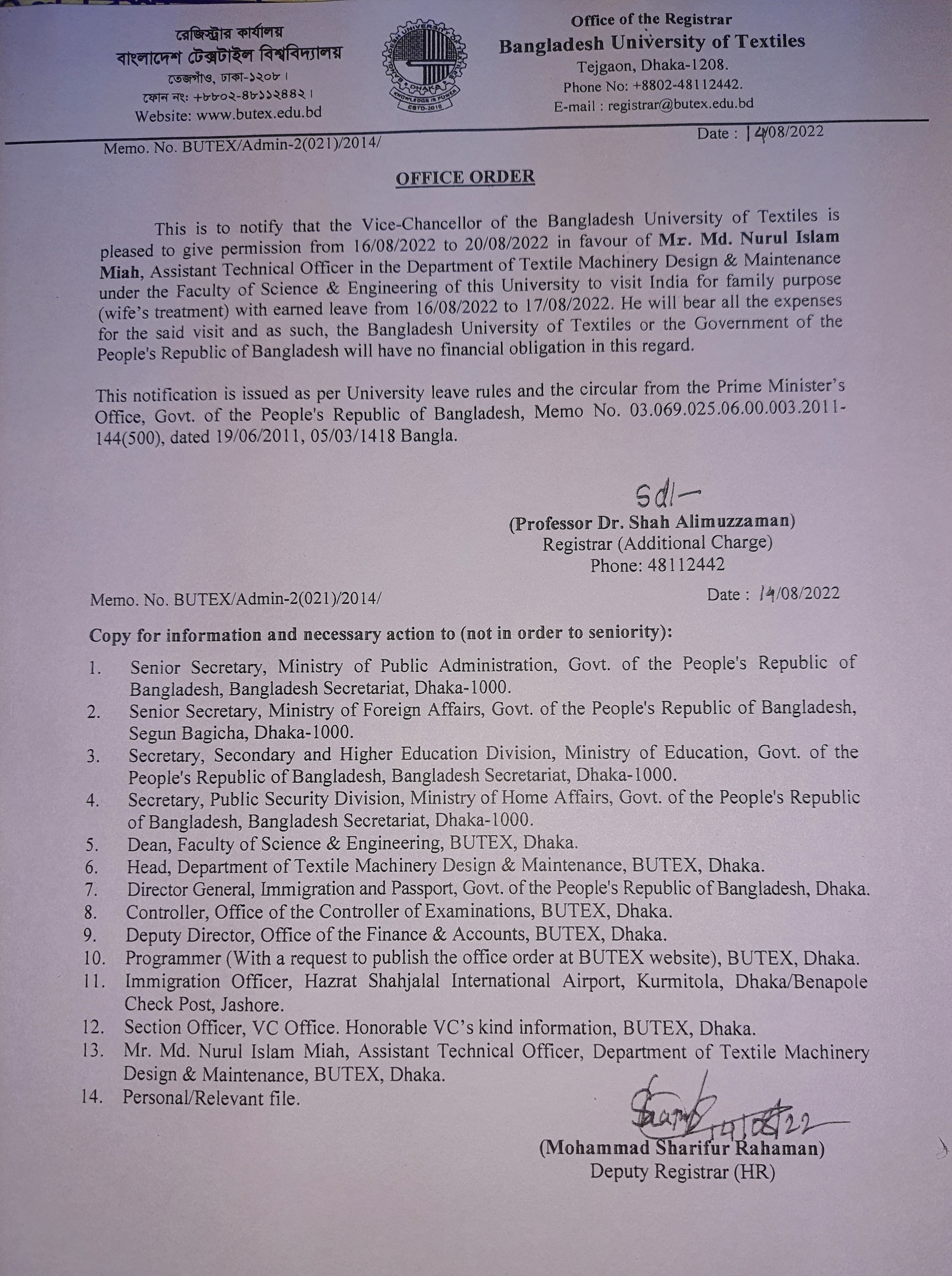 Office Order: Mr. Md. Nurul Islam Miah, Assistant Technical Officer, DoTMDM