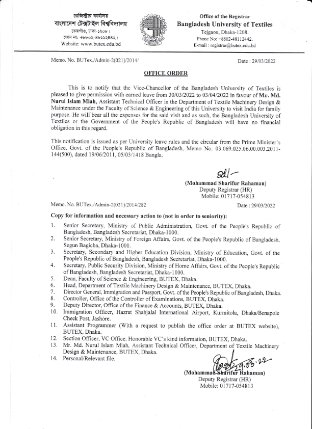 Office Order: Mr. Md. Nurul Islam Miah, Assistant Technical Officer, DoTMDM