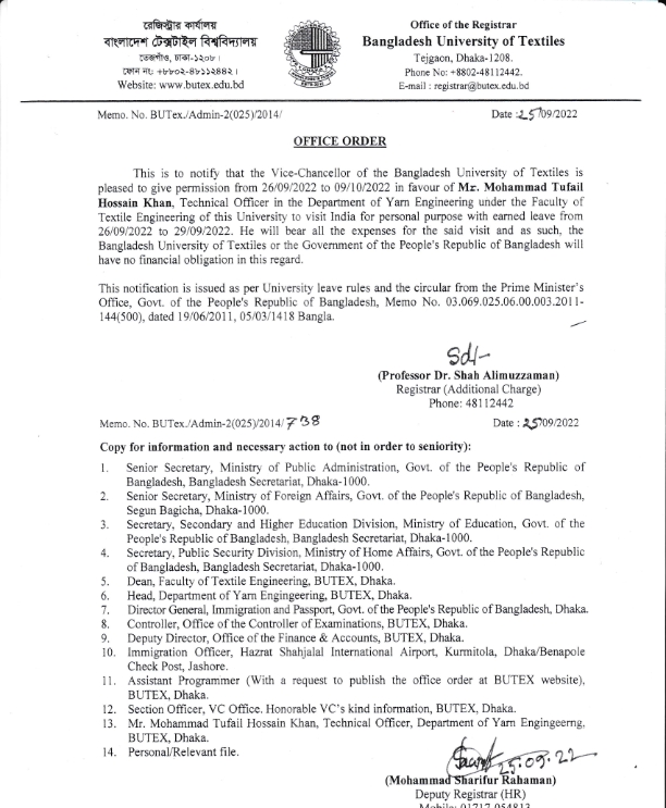 Office Order: Mr. Mohammad Tufail Hossain Khan, Technical Officer, DoYE