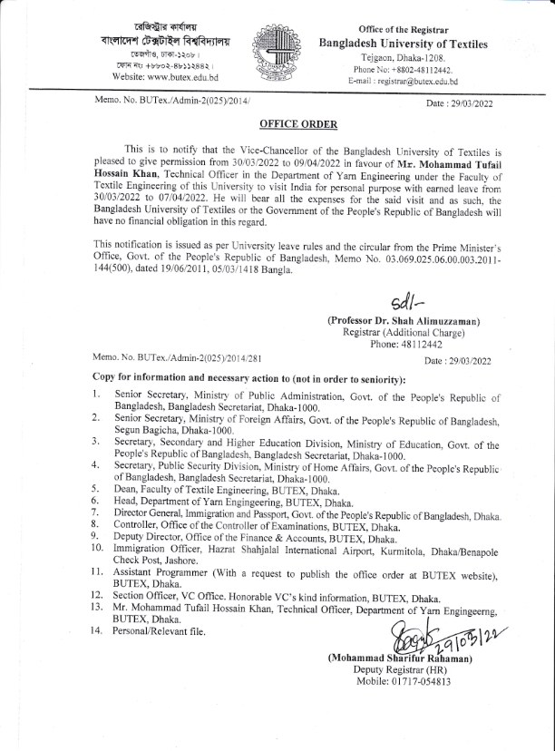 Office Order: Mr. Mohammad Tufail Hossain Khan, Technical Officer, DoYE