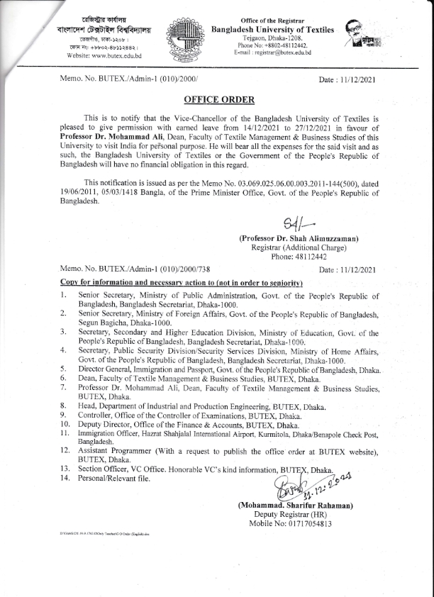 Office Order: Professor Dr. Mohammad Ali, Dean, Faculty of Textile Management and Business Studies