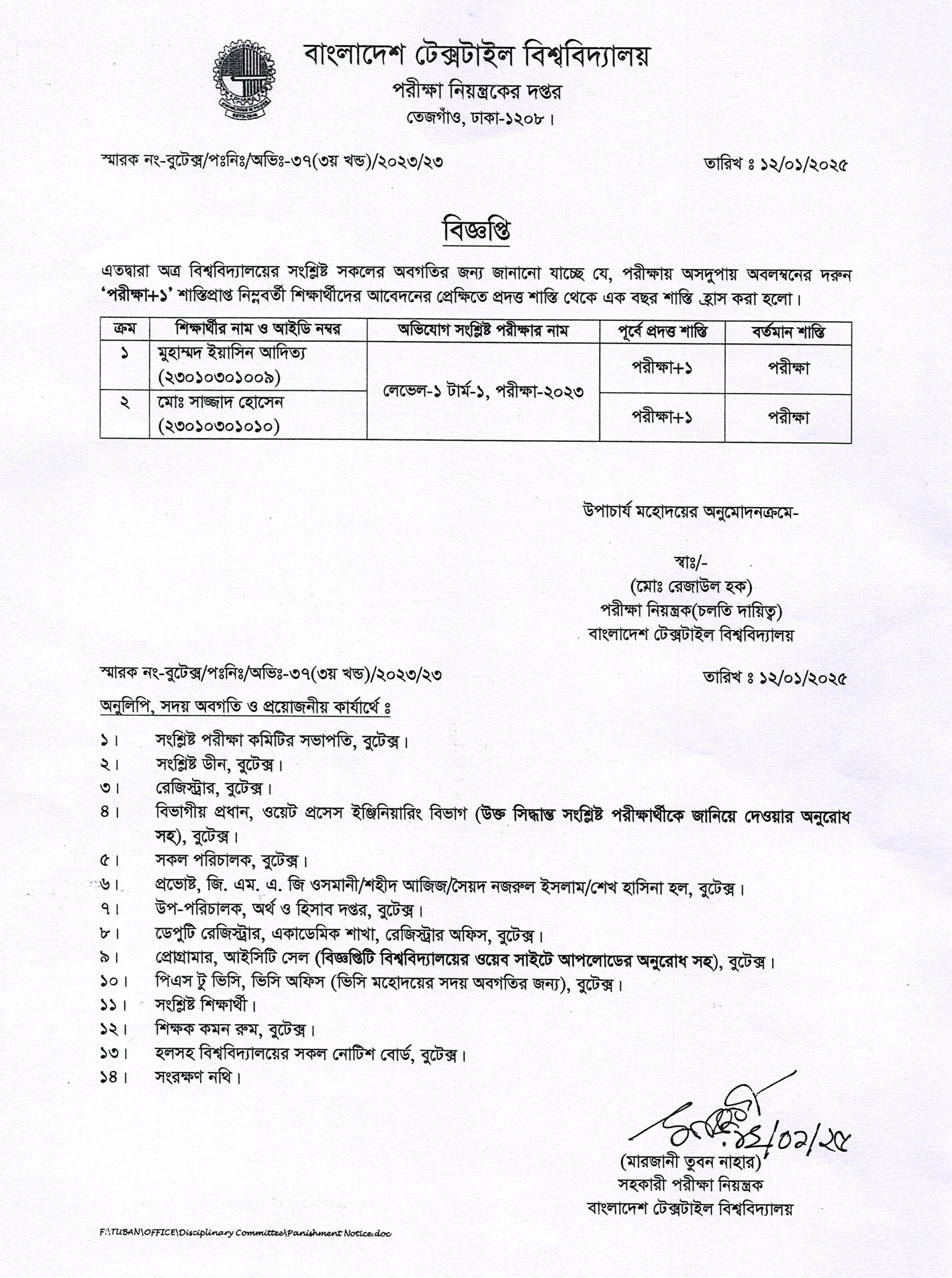 13 Jan 2025 Disciplinary Notice: BSc in Textile Eng. L-1 T-1 Exam 2023 Academic Notices, Undergrade Admission News Desk