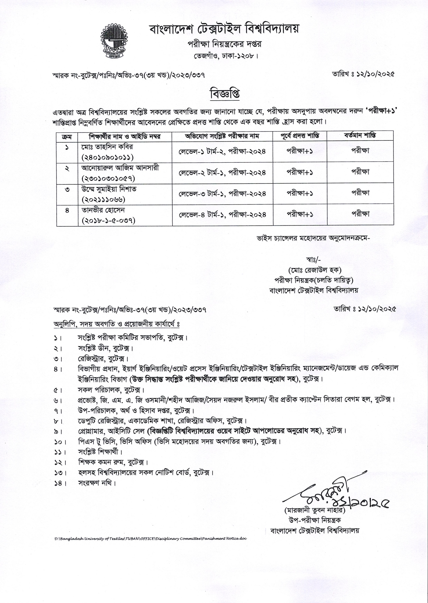 Disciplinary Notice from Exam Control Office