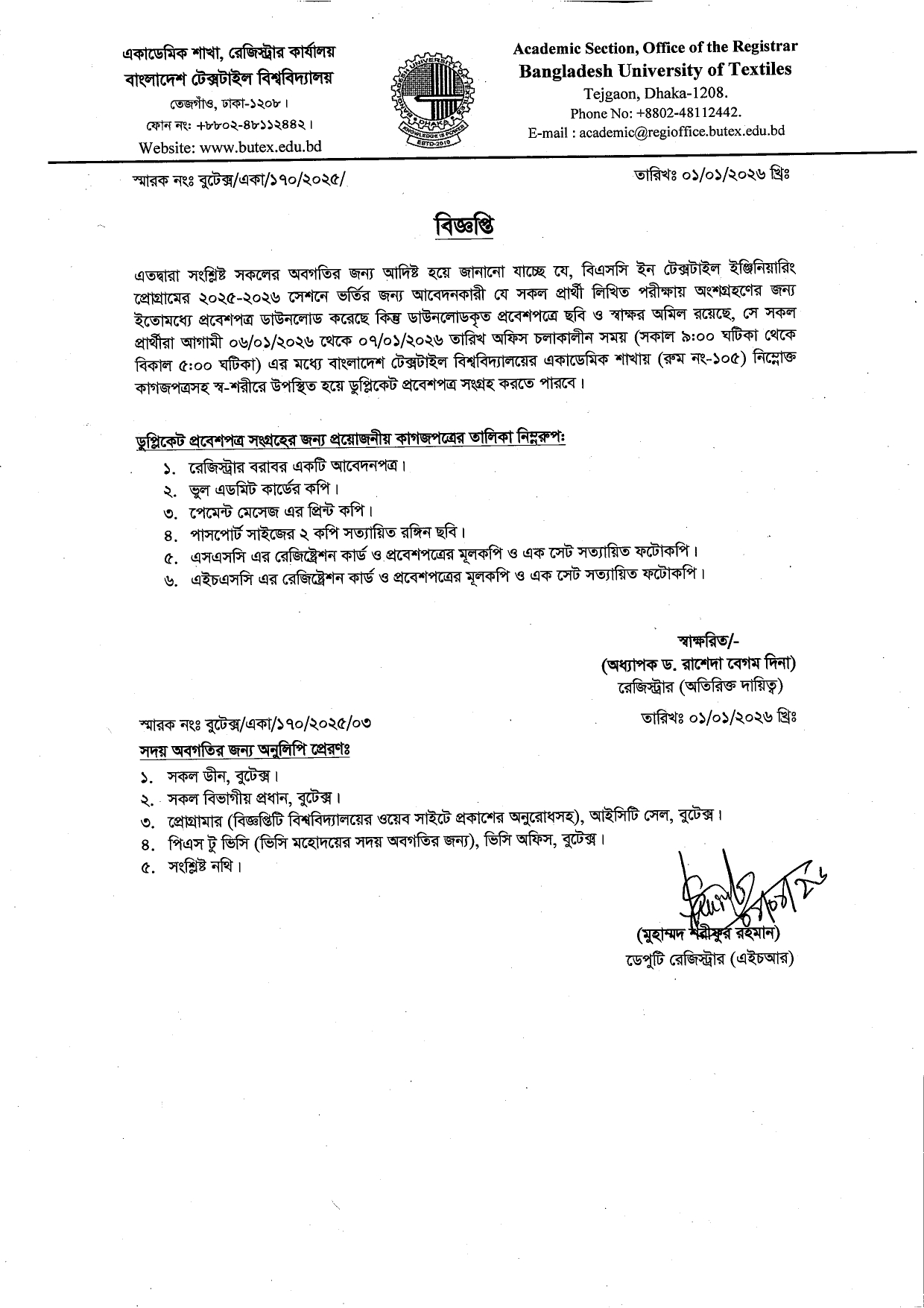 01 Jan 2026 Duplicate Admit Card issue notice for L-1 T-1 Admission Test Academic Notices, Undergrade Admission News