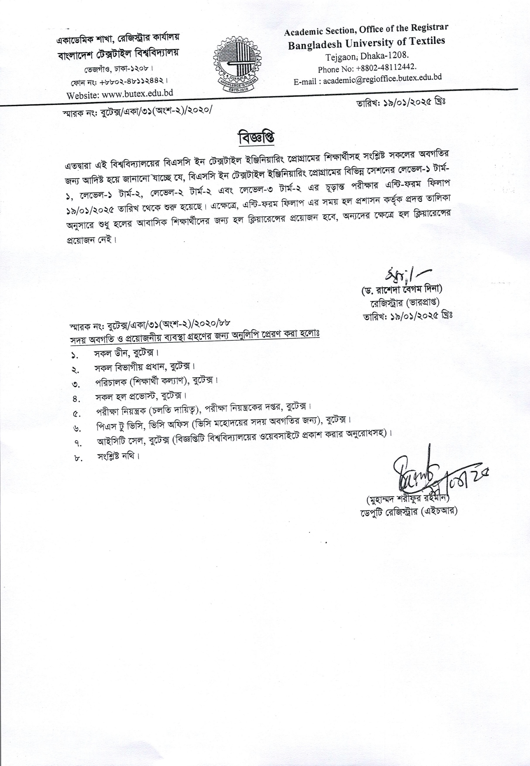 19 Jan 2025 Entry Form Notice: B.Sc. in Textile Engineering L-1 T-1, L-1 T-2, L-2 T-2, L-3 T-2 Academic Notices, Undergrade Admission News