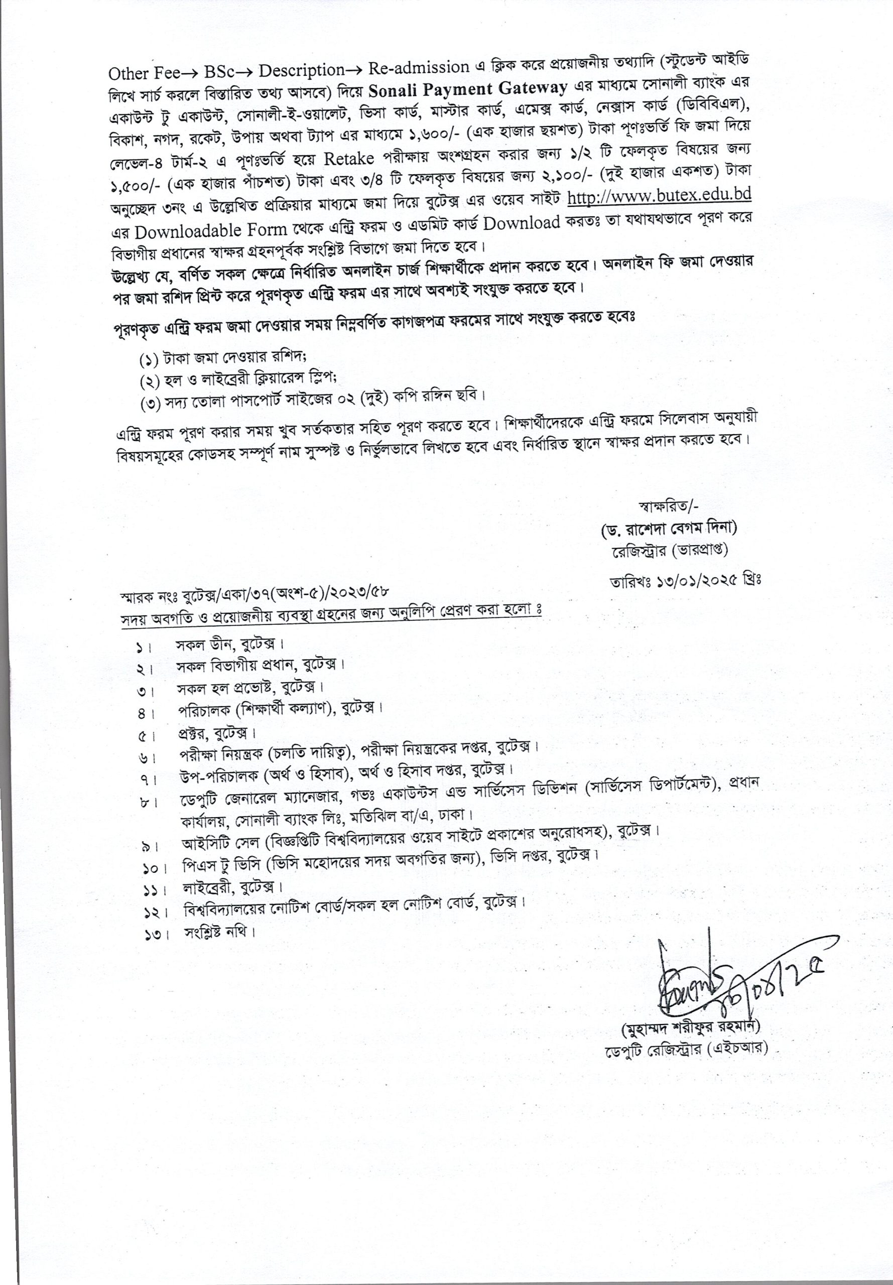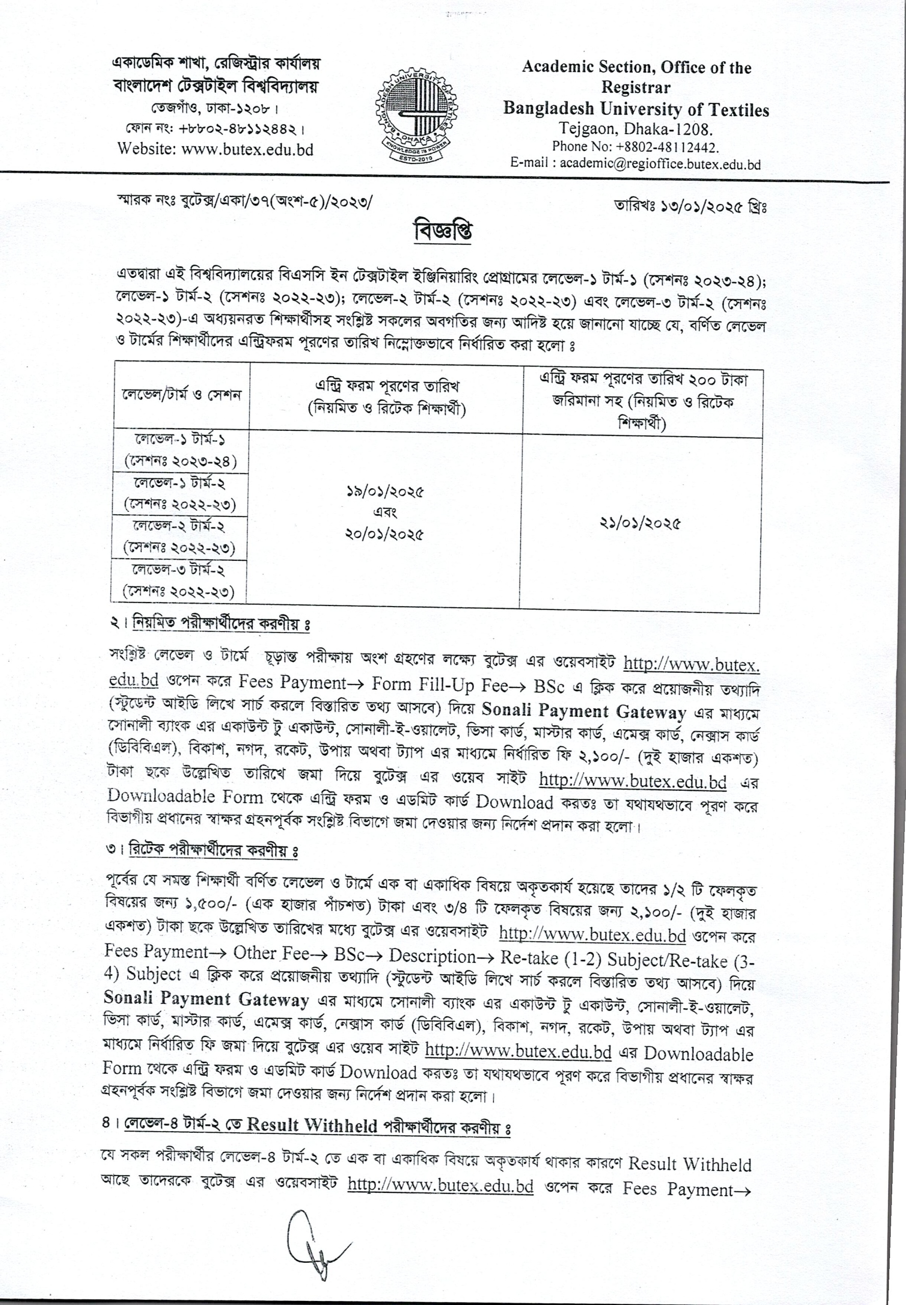 13 Jan 2025 Entry Form Notice: B.Sc. in Textile Engineering L-1 T-1, L-1 T-2, L-2 T-2, L-3 T-2 Academic Notices, Undergrade Admission News Desk