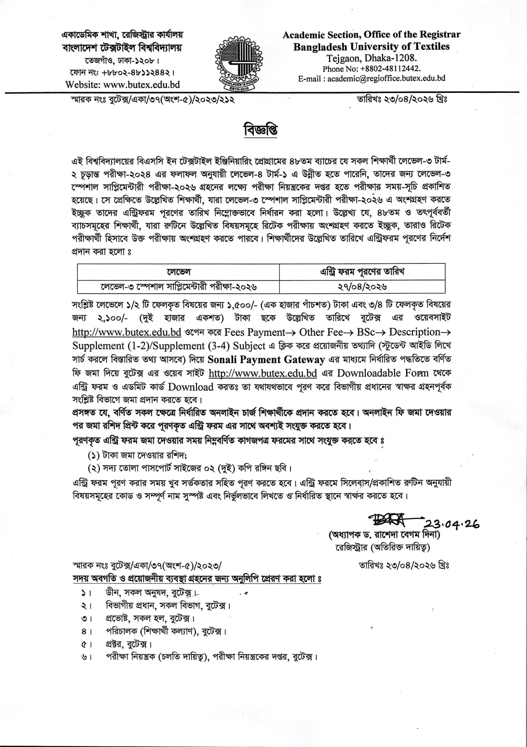 23 Apr 2026 Entry Form Notice of Special Supplementary Exam-2026 Level-3 Academic Notices, Undergrade Admission News