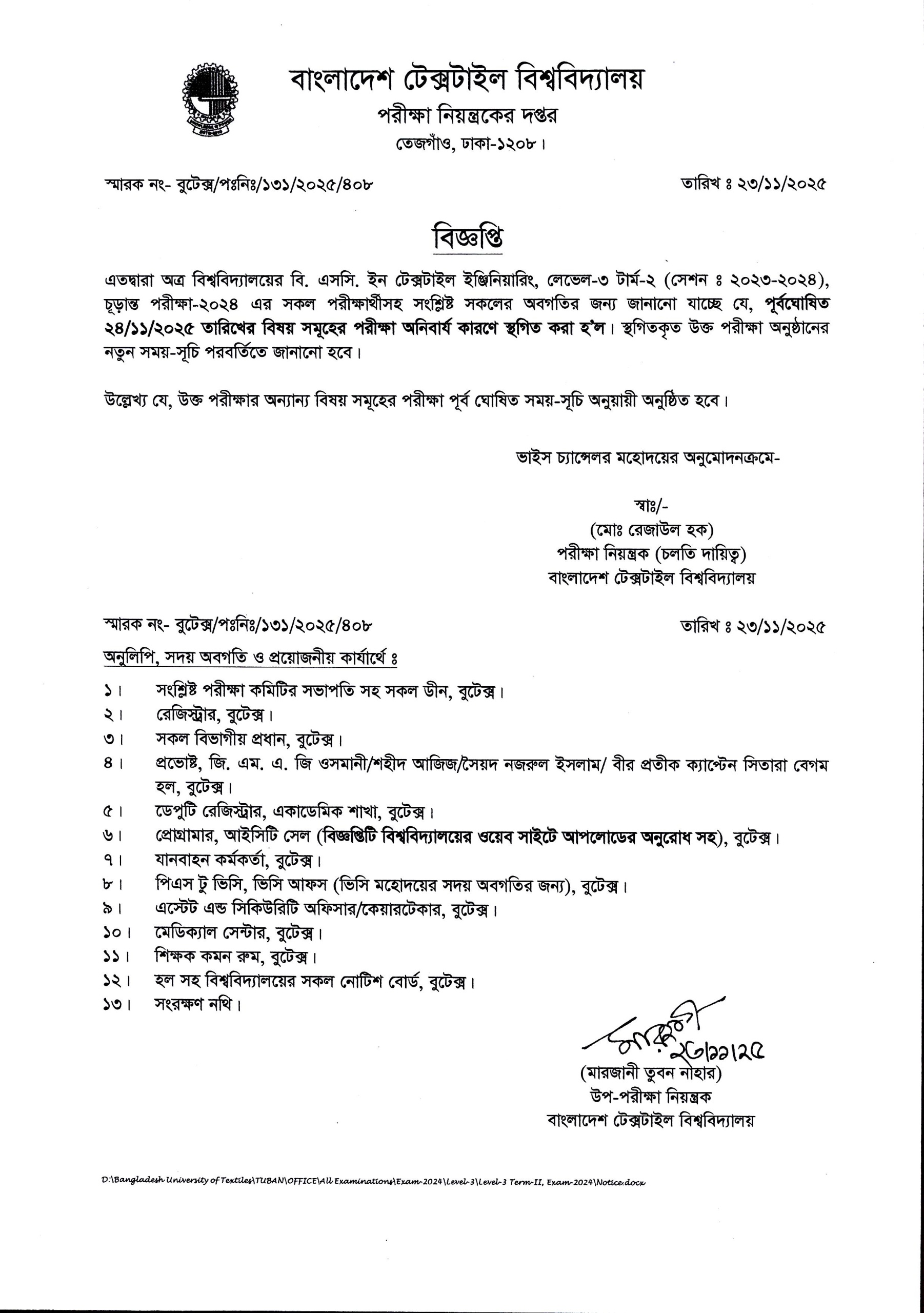 23 Nov 2025 Exam Postponed Dated 24-11-2025: BSc in Textile Engineering L-3 T-2 Academic Notices, Undergrade Admission News