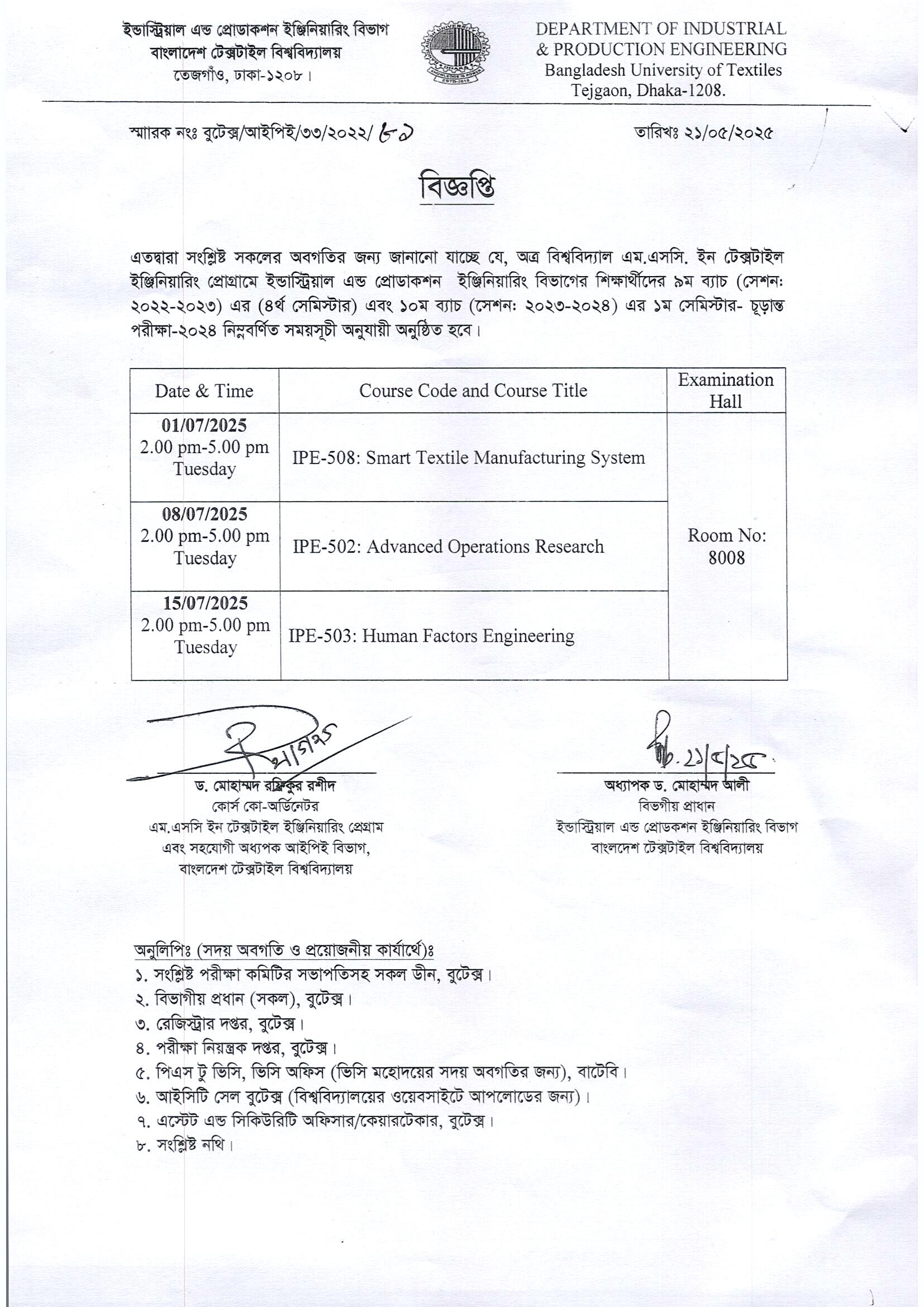 22 May 2025 Exam Routine of MSc in Textile Engineering Program (IPE) 9th Batch 4th Semester & 10th Batch 1st Semester, Exam-2024. Academic Notices, DIPE News