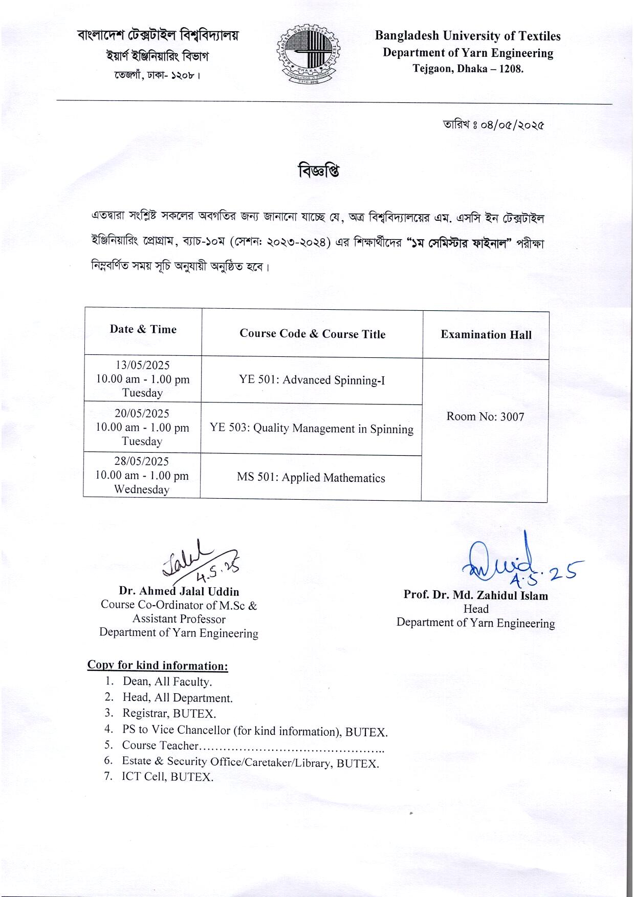 04 May 2025 Exam Routine of MSc in Textile Engineering Program (Yarn) 10th Batch 1st Semester Academic Notices News