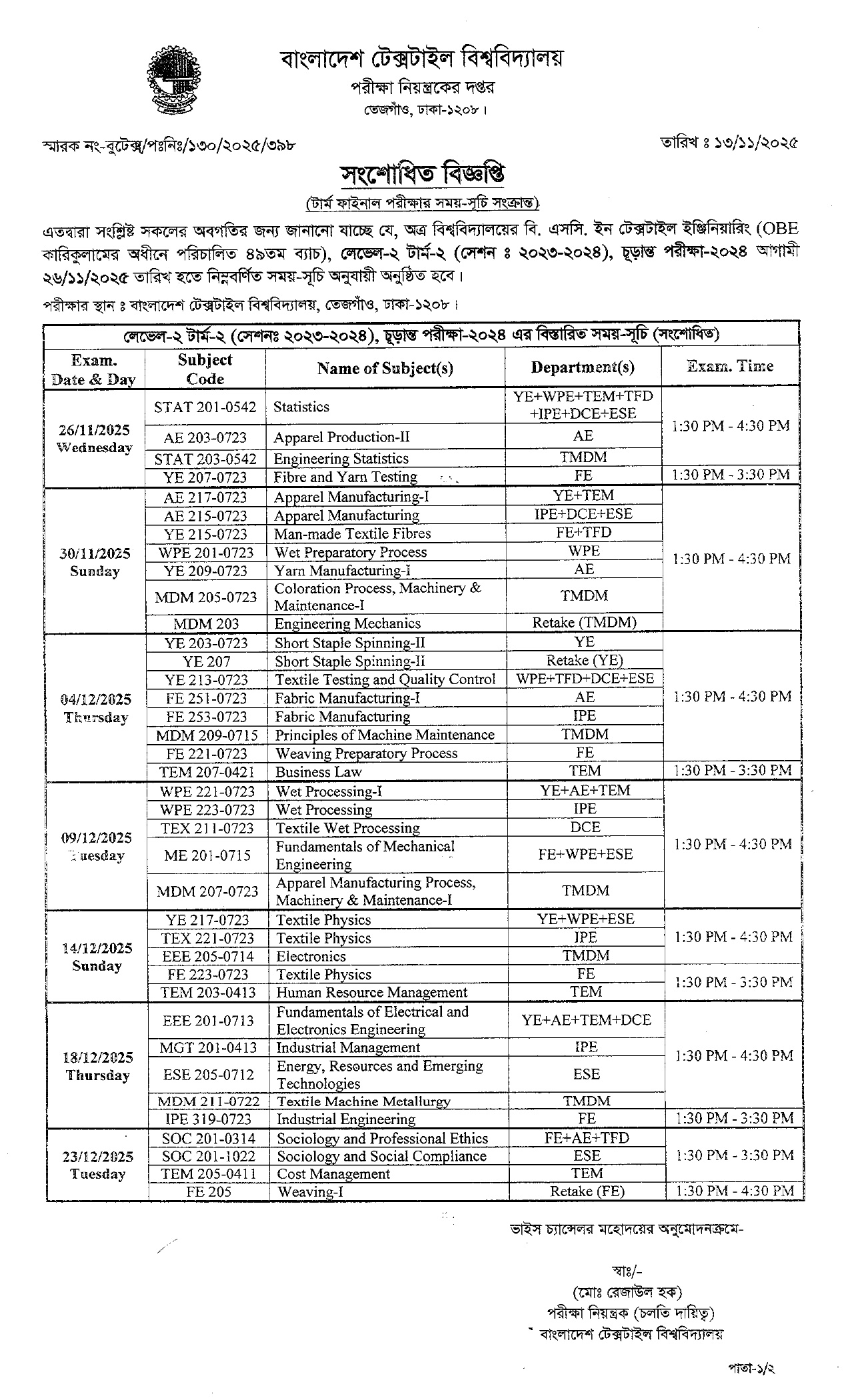 Revised Exam Schedule: BSc in Textile Engineering L2-T2