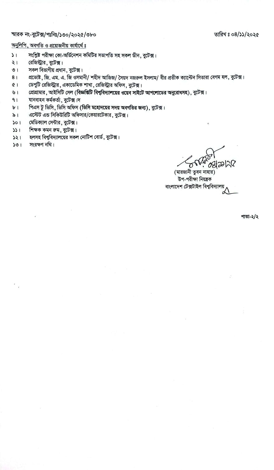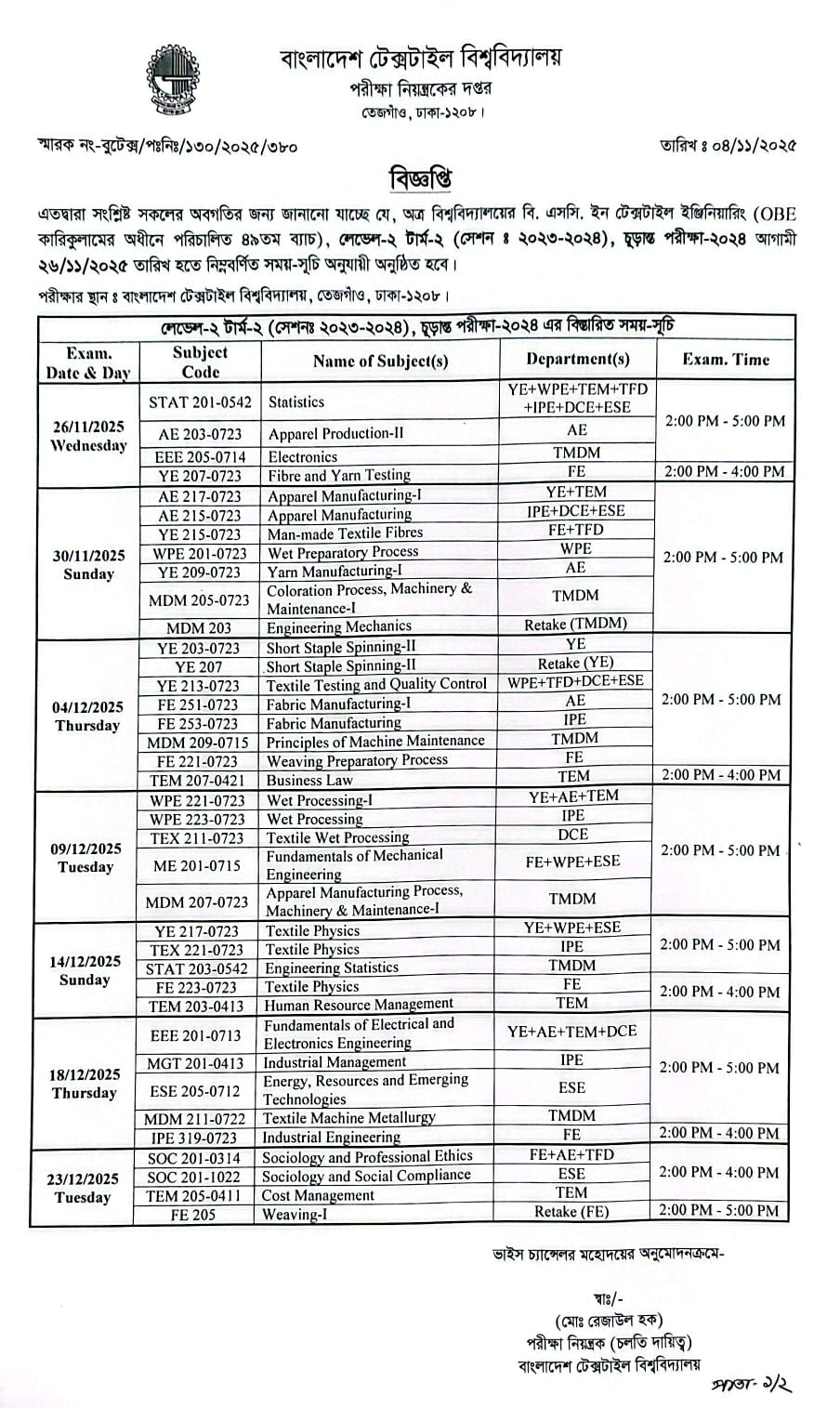 Exam Schedule: BSc in Textile Engineering L2-T2