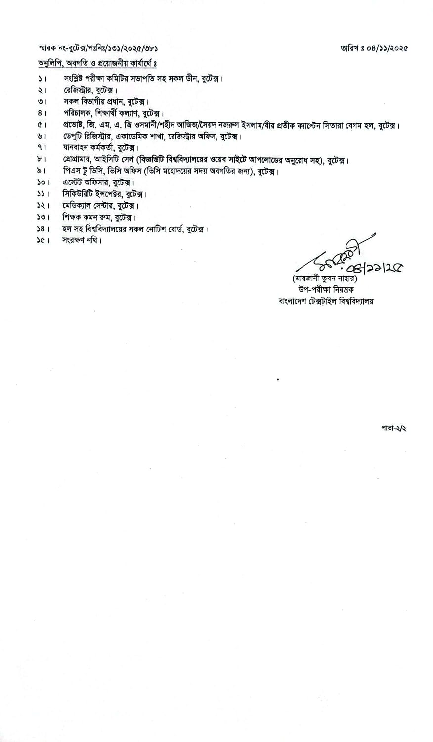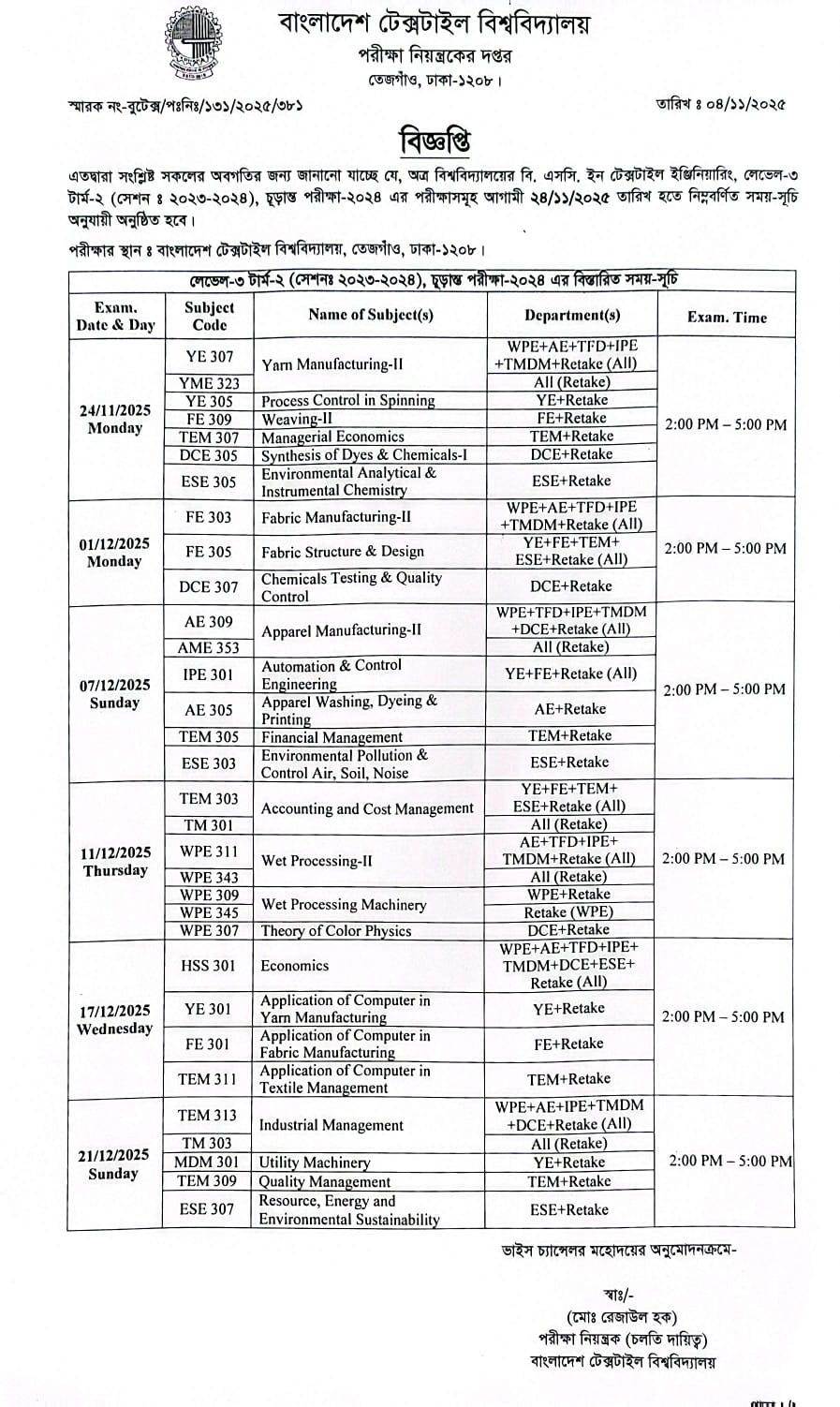 Exam Schedule: BSc in Textile Engineering L3-T2